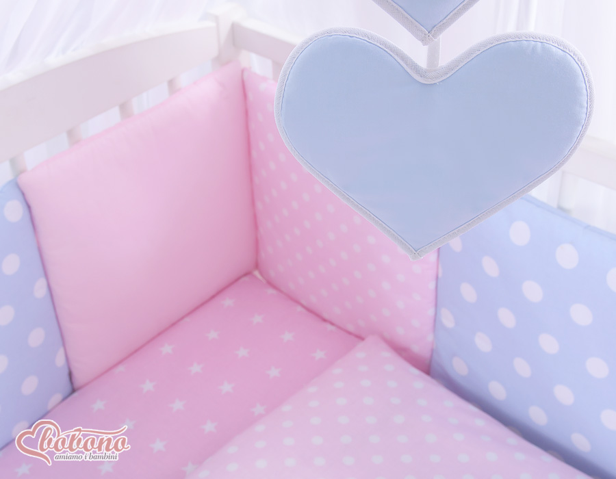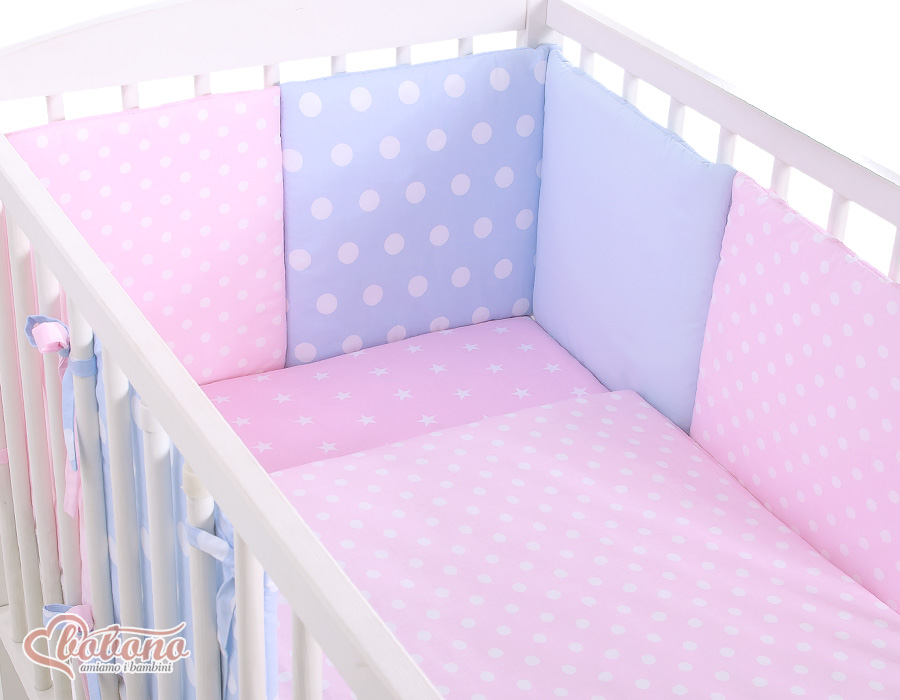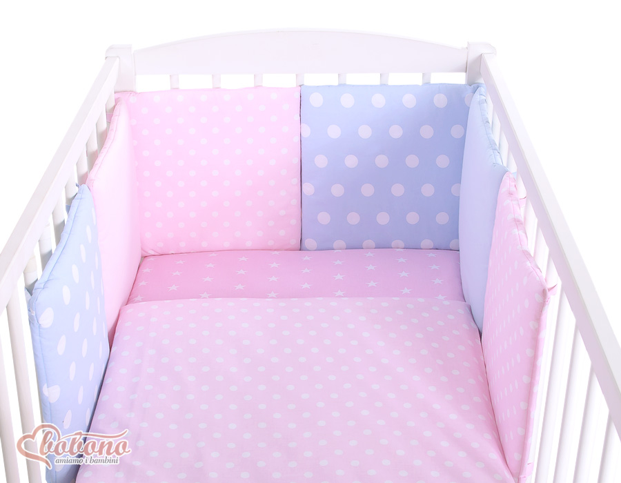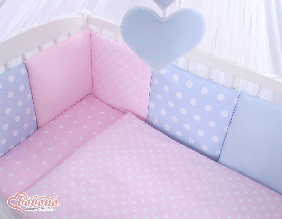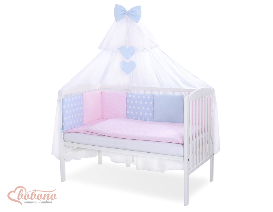The 11-pcs set includes: 1. Double-sided pillow cover 40x60 cm (fabric 100% Cotton) 2. Double-sided duvet cover 90x120cm or 100x135cm (fabric 100% Cotton) 3-8. Universal bumper 6pcs- the bumper is made of 6 pillows filled with a special non-allergic and breathable silicone Filling (certified OKOTEX). The size of one pillow is 32cm x 32cm. Cover of the bumper or made of 100% cotton. Pillows have fastening strips to match them each other. You can match the pillows in any order. It is a perfect decoration of baby cot. If we match every pillows together the bumper can be used as a playing mat for baby. 9. Mosquito-net made of Chiffon (470x160cm) 10. Bow+ 11. Hanging applications.
