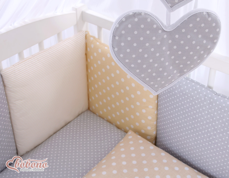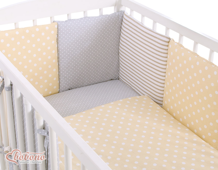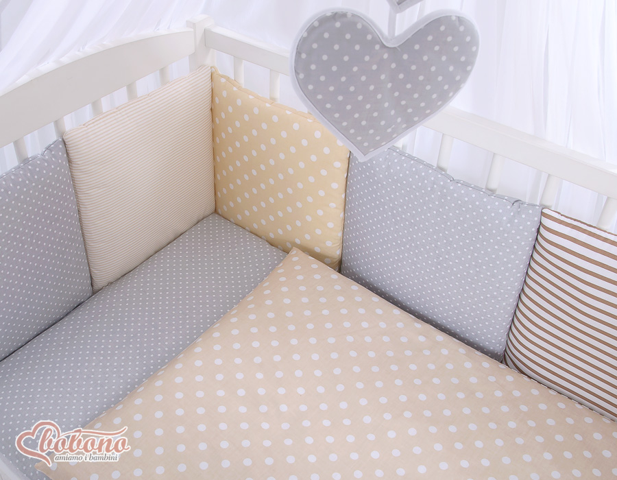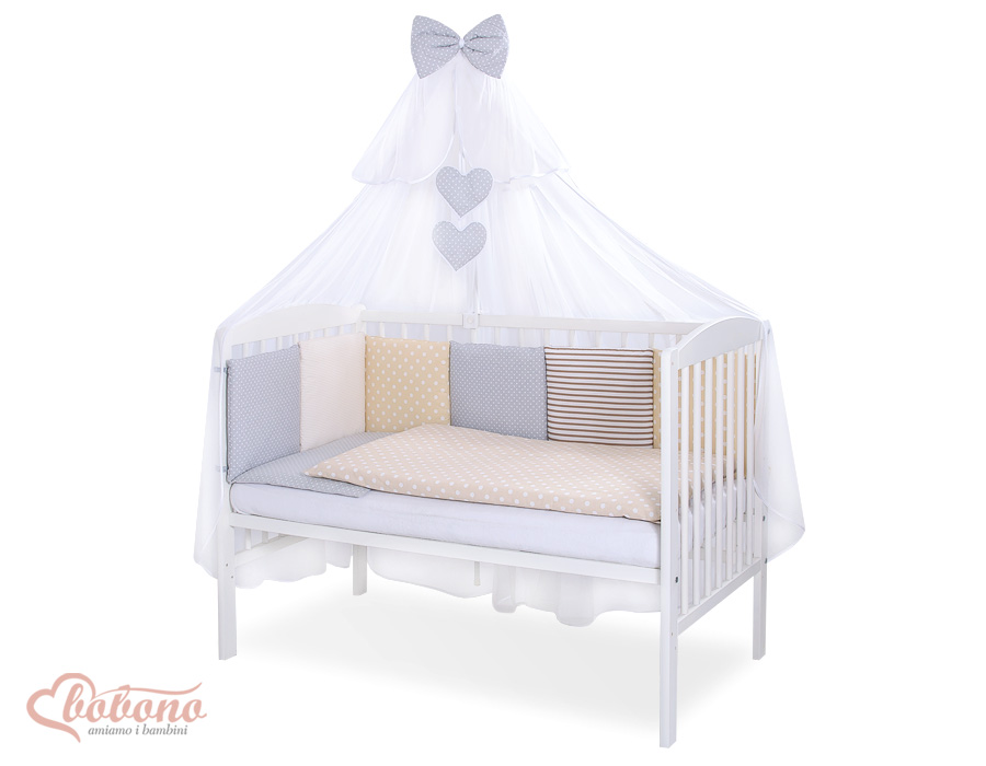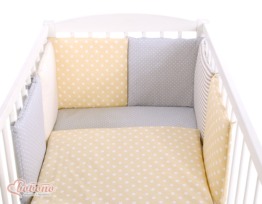 The 11-pcs set includes: 1. Double-sided pillow cover 40x60 cm (fabric 100% Cotton) 2. Double-sided duvet cover 90x120cm or 100x135cm (fabric 100% Cotton) 3-8. Universal bumper 6pcs- the bumper is made of 6 pillows filled with a special non-allergic and breathable silicone Filling (certified OKOTEX). The size of one pillow is 32cm x 32cm. Cover of the bumper or made of 100% cotton. Pillows have fastening strips to match them each other. You can match the pillows in any order. It is a perfect decoration of baby cot. If we match every pillows together the bumper can be used as a playing mat for baby. 9. Mosquito-net made of Chiffon (470x160cm) 10. Bow+ 11. Hanging applications.