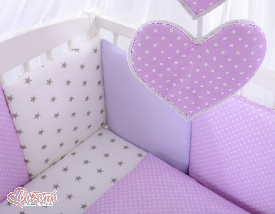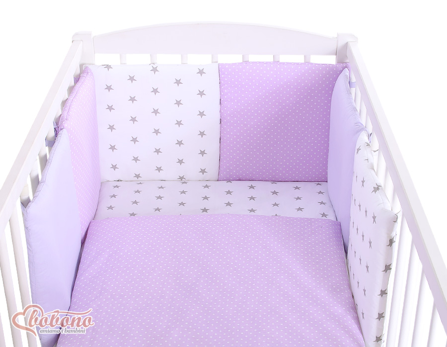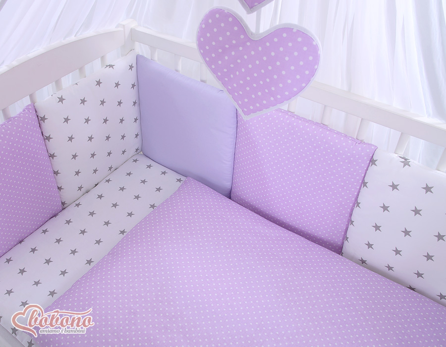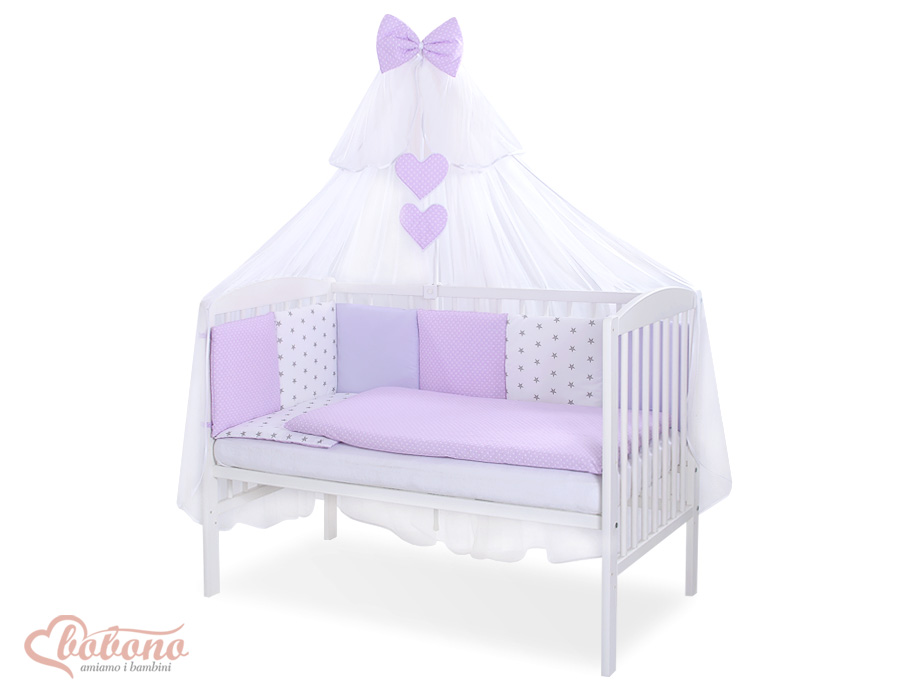 The 11-pcs set includes: 1. Double-sided pillow cover 40x60 cm (fabric 100% Cotton) 2. Double-sided duvet cover 90x120cm or 100x135cm (fabric 100% Cotton) 3-8. Universal bumper 6pcs- the bumper is made of 6 pillows filled with a special non-allergic and breathable silicone Filling (certified OKOTEX). The size of one pillow is 32cm x 32cm. Cover of the bumper or made of 100% cotton. Pillows have fastening strips to match them each other. You can match the pillows in any order. It is a perfect decoration of baby cot. If we match every pillows together the bumper can be used as a playing mat for baby. 9. Mosquito-net made of Chiffon (470x160cm) 10. Bow+ 11. Hanging applications.