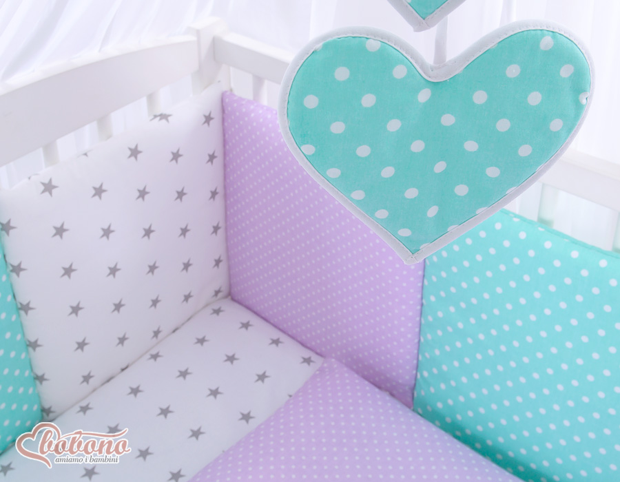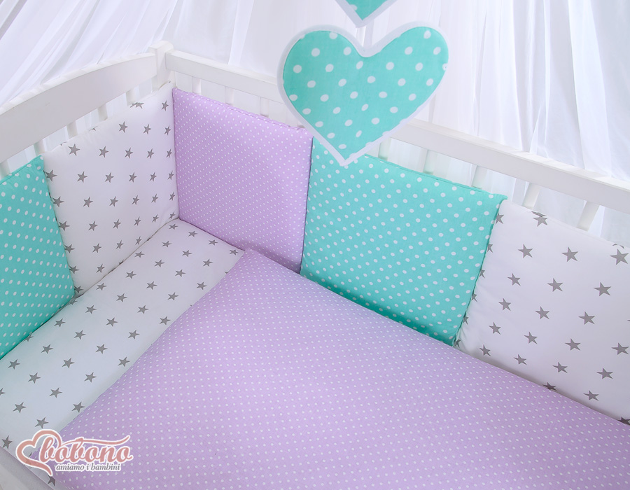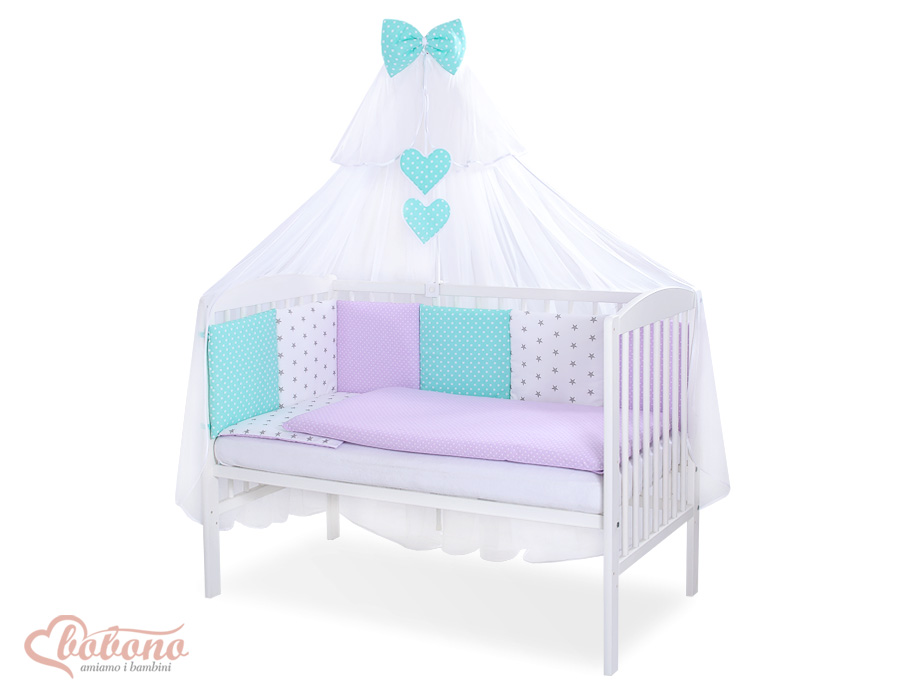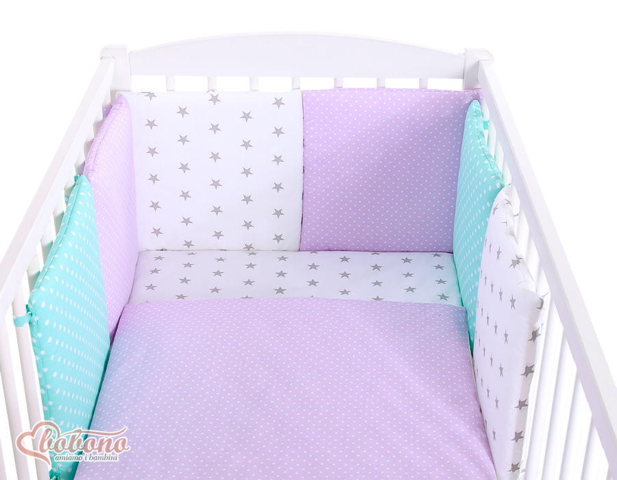 The 11-pcs set includes: 1. Double-sided pillow cover 40x60 cm (fabric 100% Cotton) 2. Double-sided duvet cover 90x120cm or 100x135cm (fabric 100% Cotton) 3-8. Universal bumper 6pcs- the bumper is made of 6 pillows filled with a special non-allergic and breathable silicone Filling (certified OKOTEX). The size of one pillow is 32cm x 32cm. Cover of the bumper or made of 100% cotton. Pillows have fastening strips to match them each other. You can match the pillows in any order. It is a perfect decoration of baby cot. If we match every pillows together the bumper can be used as a playing mat for baby. 9. Mosquito-net made of Chiffon (470x160cm) 10. Bow+ 11. Hanging applications.