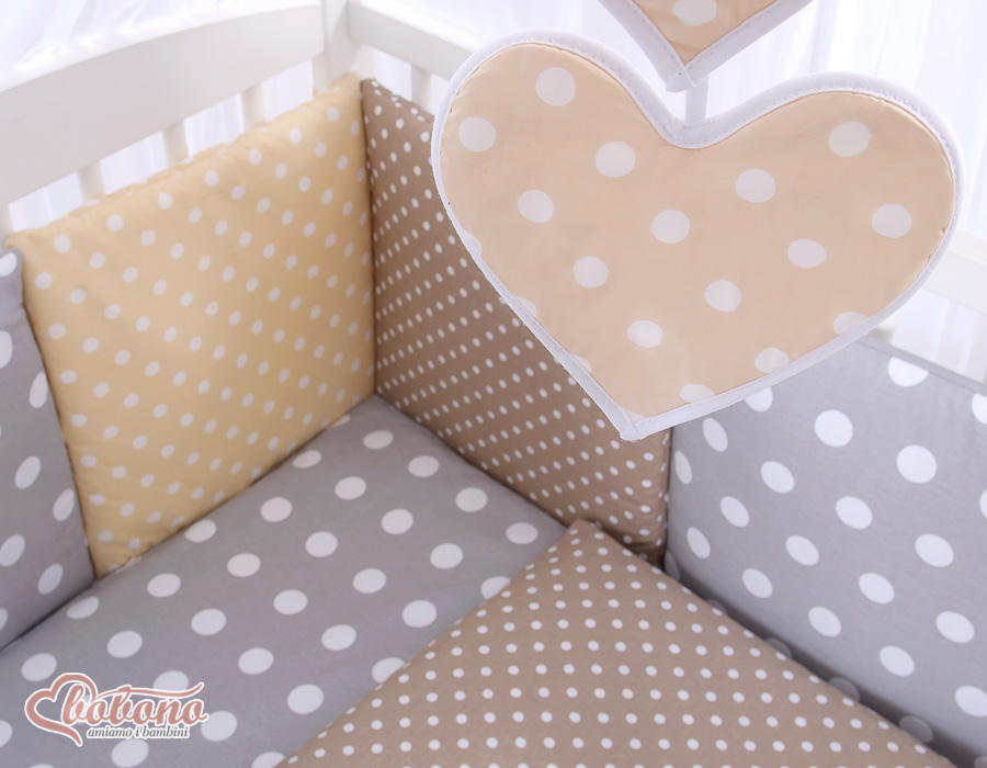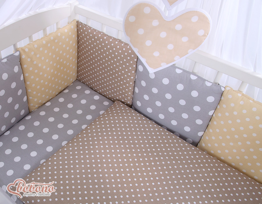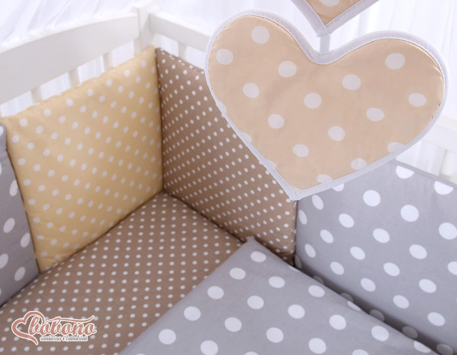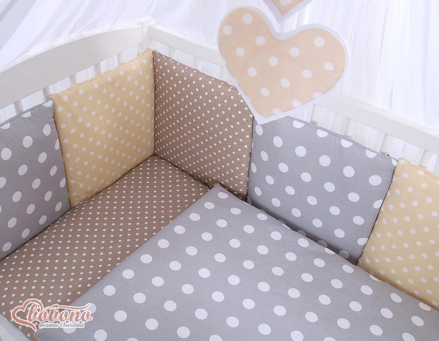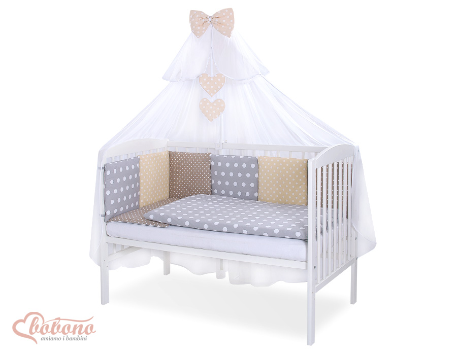 The 11-pcs set includes: 1. Double-sided pillow cover 40x60 cm (fabric 100% Cotton) 2. Double-sided duvet cover 90x120cm or 100x135cm (fabric 100% Cotton) 3-8. Universal bumper 6pcs- the bumper is made of 6 pillows filled with a special non-allergic and breathable silicone Filling (certified OKOTEX). The size of one pillow is 32cm x 32cm. Cover of the bumper or made of 100% cotton. Pillows have fastening strips to match them each other. You can match the pillows in any order. It is a perfect decoration of baby cot. If we match every pillows together the bumper can be used as a playing mat for baby. 9. Mosquito-net made of Chiffon (470x160cm) 10. Bow+ 11. Hanging applications.