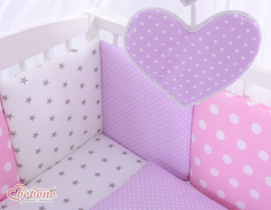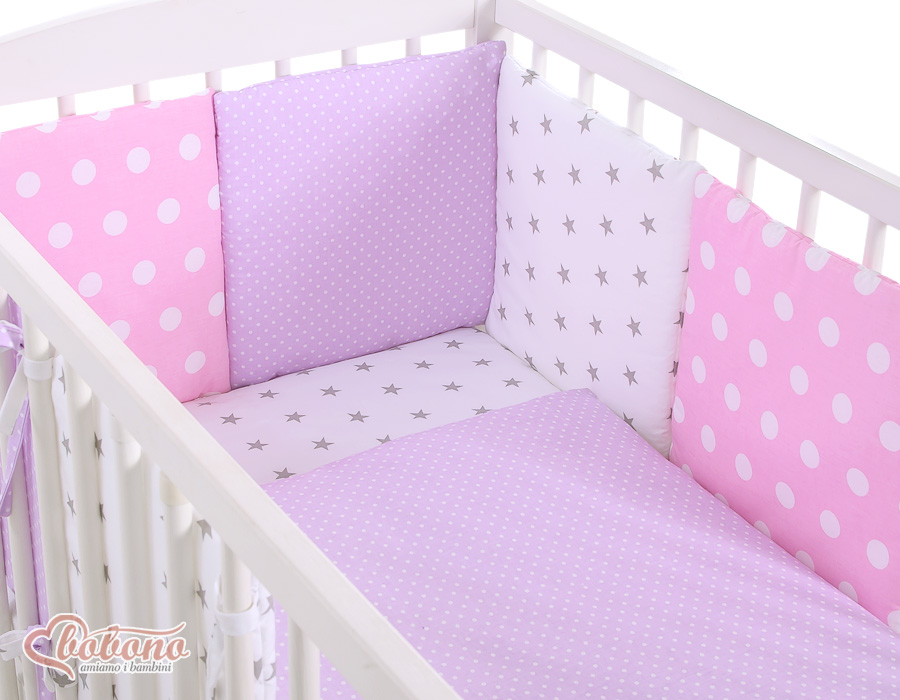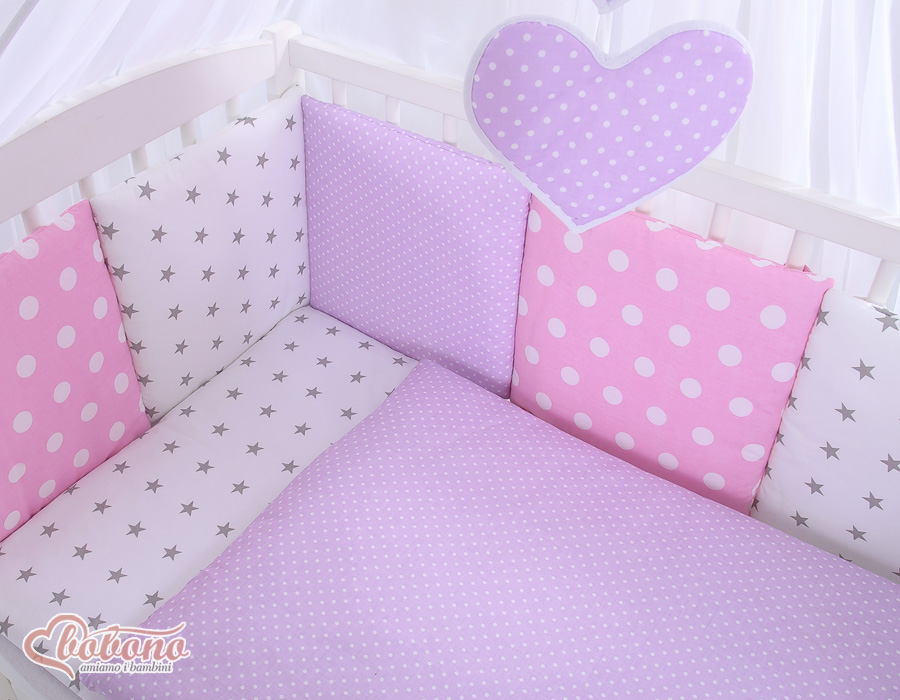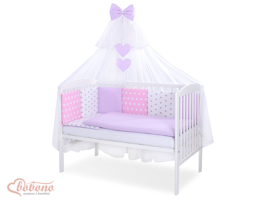 The 11-pcs set includes: 1. Double-sided pillow cover 40x60 cm (fabric 100% Cotton) 2. Double-sided duvet cover 90x120cm or 100x135cm (fabric 100% Cotton) 3-8. Universal bumper 6pcs- the bumper is made of 6 pillows filled with a special non-allergic and breathable silicone Filling (certified OKOTEX). The size of one pillow is 32cm x 32cm. Cover of the bumper or made of 100% cotton. Pillows have fastening strips to match them each other. You can match the pillows in any order. It is a perfect decoration of baby cot. If we match every pillows together the bumper can be used as a playing mat for baby. 9. Mosquito-net made of Chiffon (470x160cm) 10. Bow+ 11. Hanging applications.