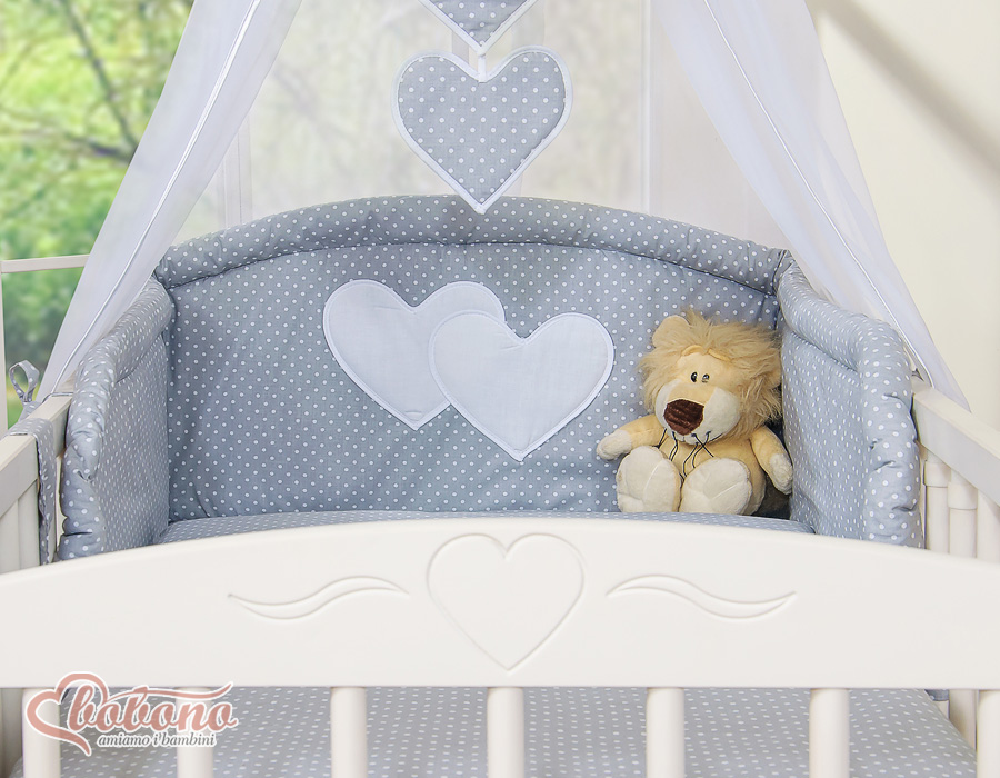 Baby Shop » Bedding sets for cots and beds » Collection HEARTS » Bedding sets for cot 140cm » Bedding set 11-pcs with canopy » Bedding set 11-pcs with canopy and Holder - Hanging Hearts white polka dots on Gray