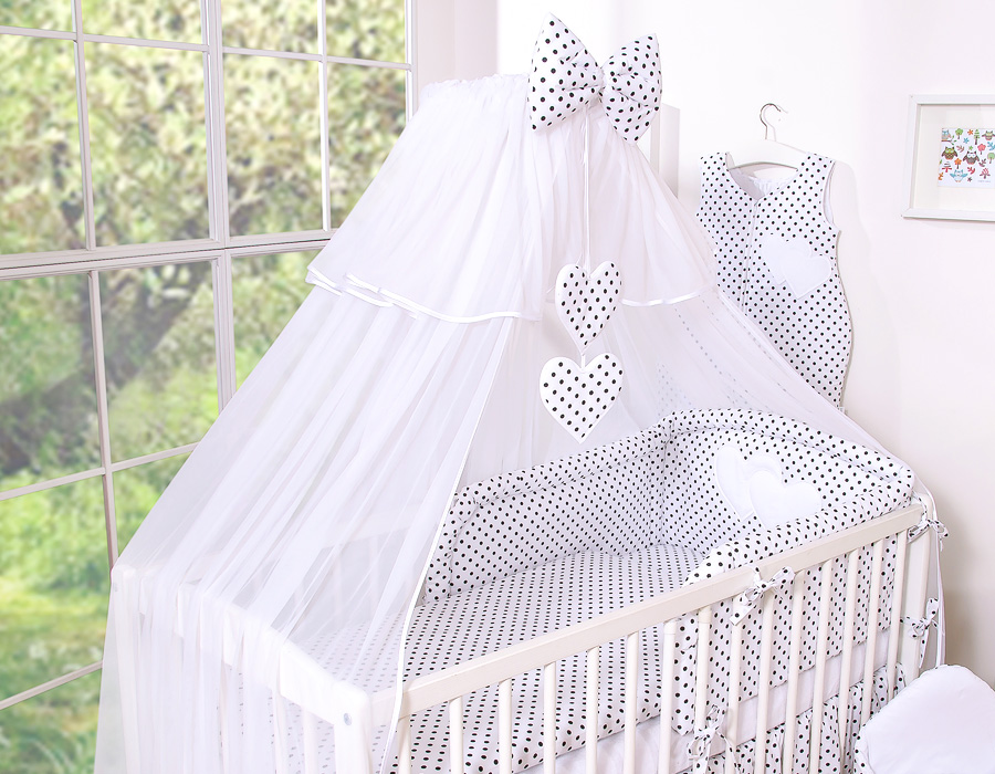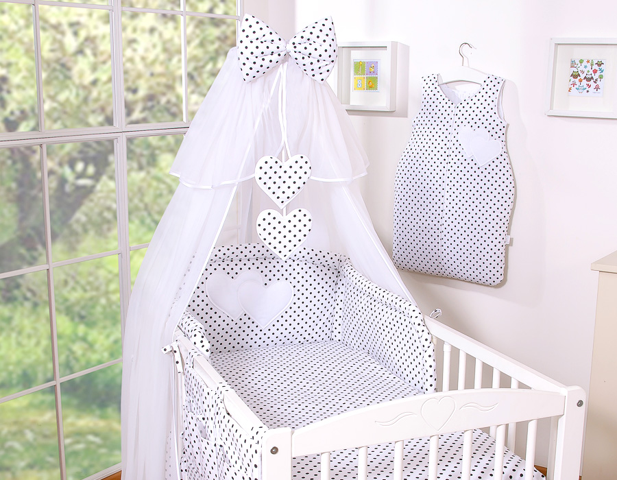 Bedding set 11-pcs with mosquito-net- Hanging Hearts black dots on white In the lovingly designed bedding it wonderful to sleep. Skin-friendly quality invites you to dream.