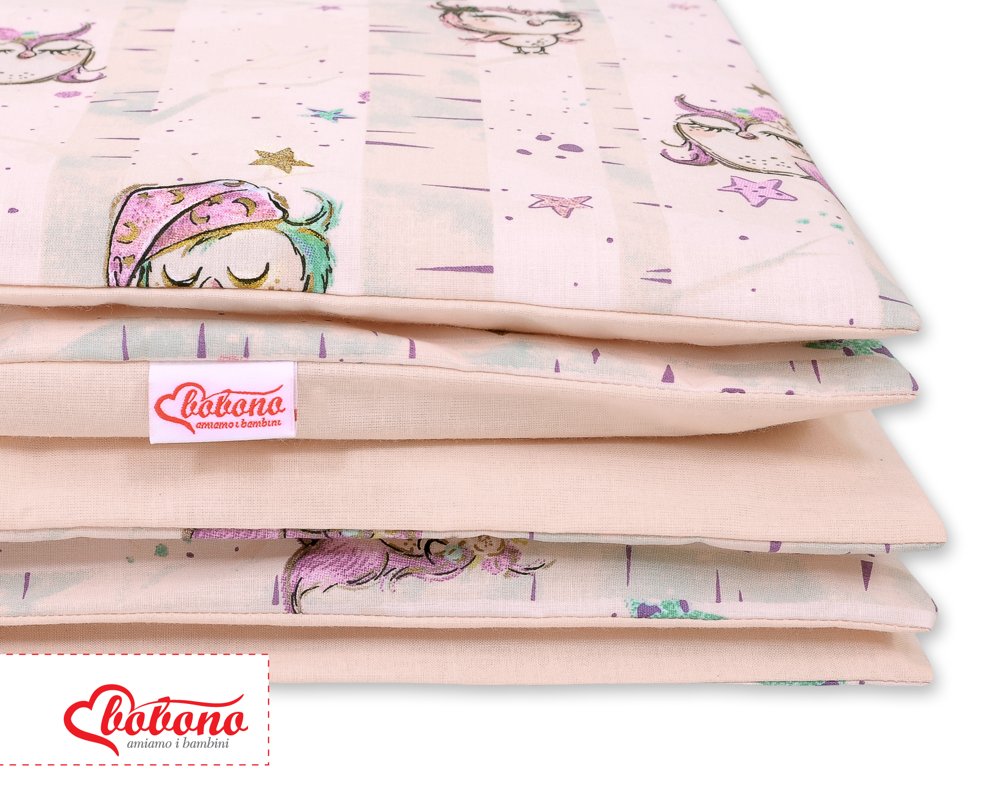 Babies bedding set in which your child will have the most beautiful dreams. Made of durable 100% certified cotton. The fabric has a delicate gilding, which gives it even more fairytale character. It is nice to touch. It does not irritate the delicate skin of the child. In this bedding your child will sleep soundly and safely. Interesting printed patterns have a positive effect on the child's development by stimulating his imagination.