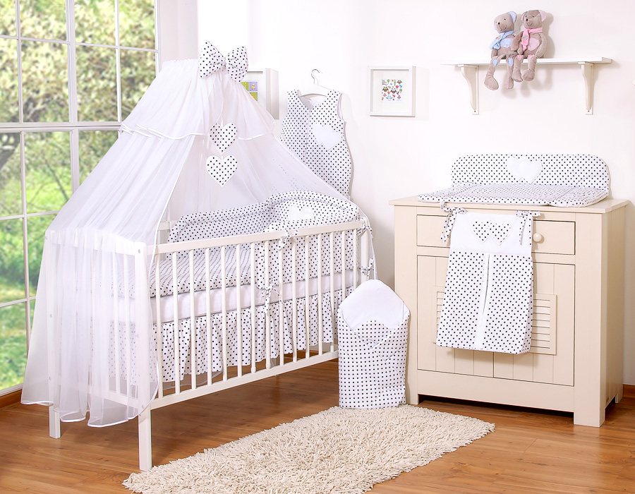 Baby Shop » Bedding sets for cots and beds » Collection HEARTS » Bedding sets for cot 120cm » Bedding set 5-pcs with mosquito-net » Bedding set 5-pcs bumper cases mosquito-net- Hanging Hearts black dots on white