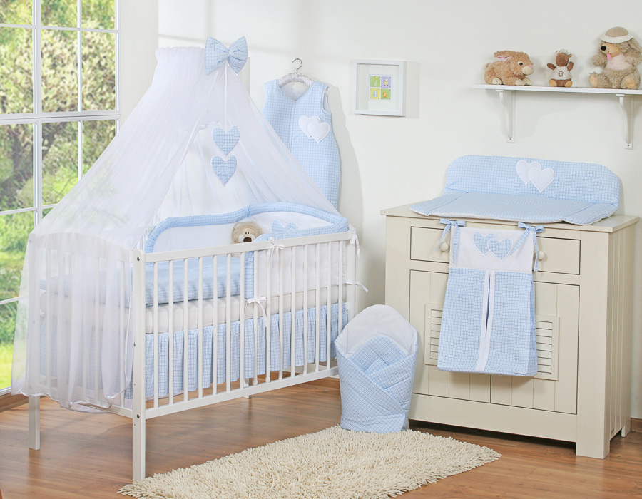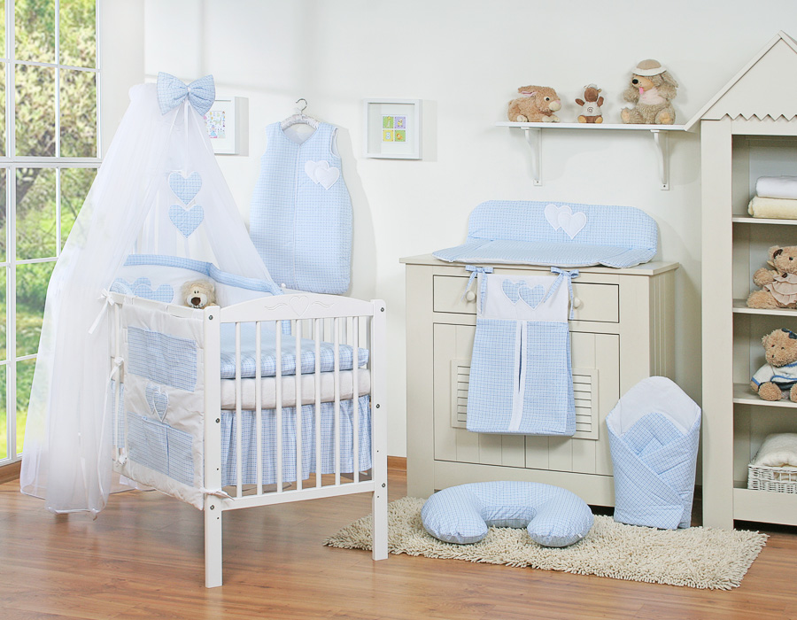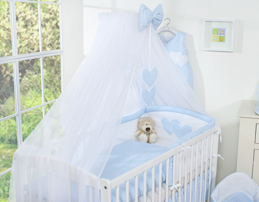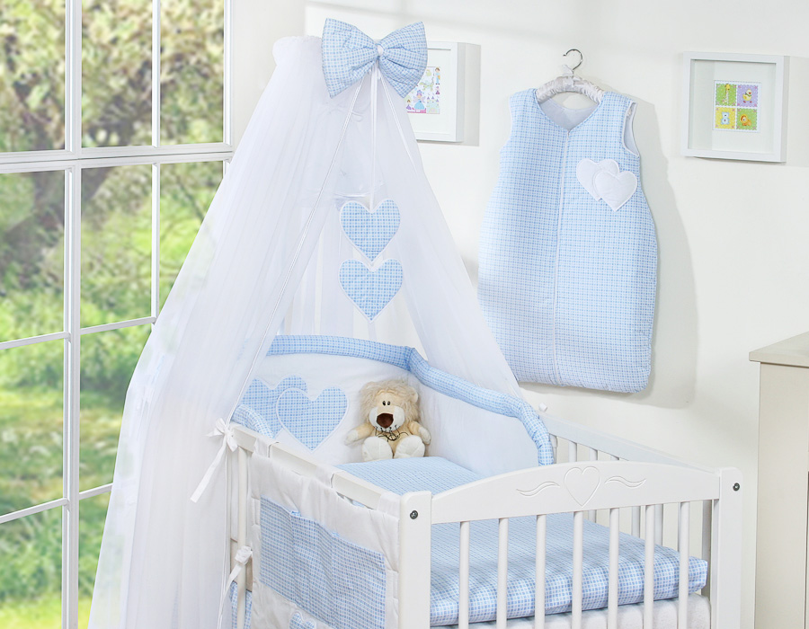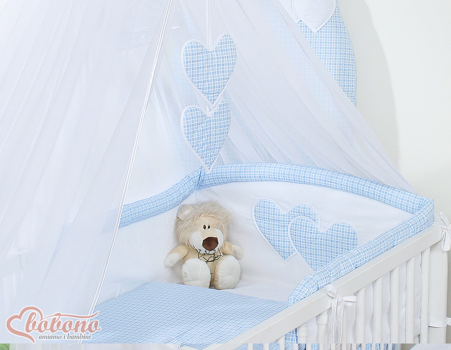Bedding set 5-pcs bumper cases mosquito-net- Hanging Hearts blue checkered In the lovingly designed bedding it wonderful to sleep. Skin-friendly quality invites you to dream.