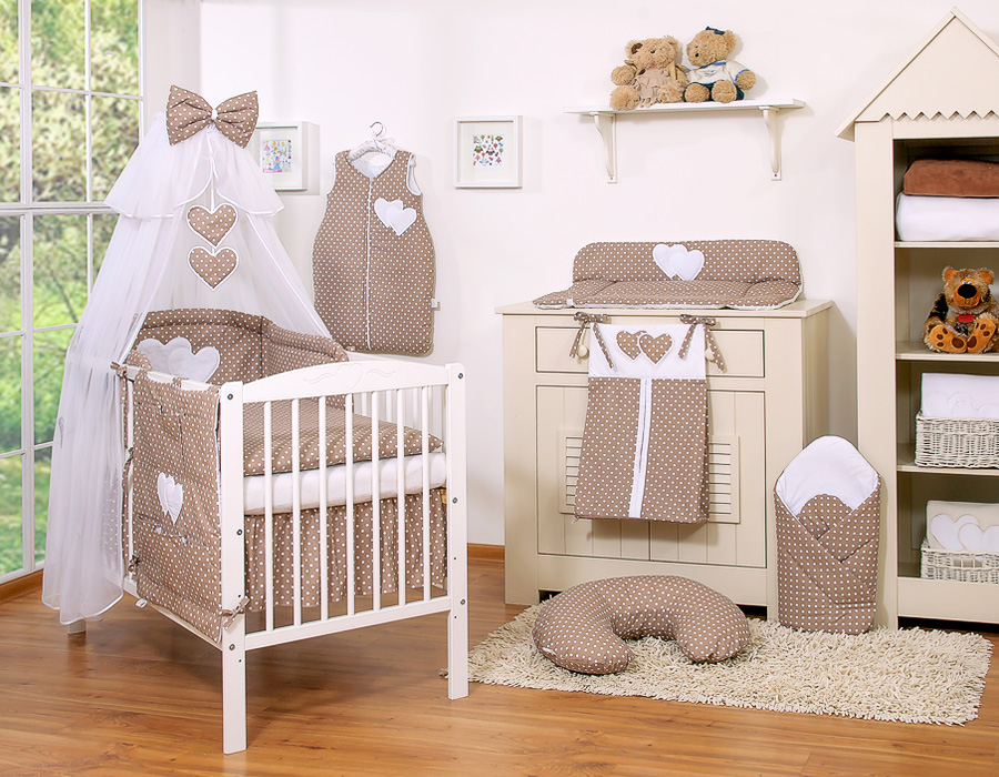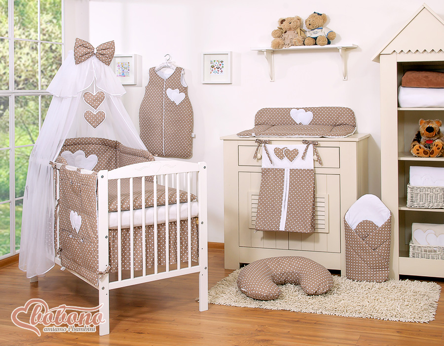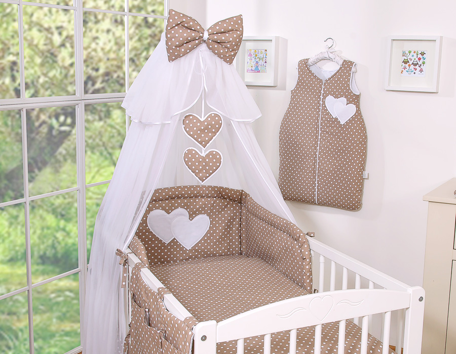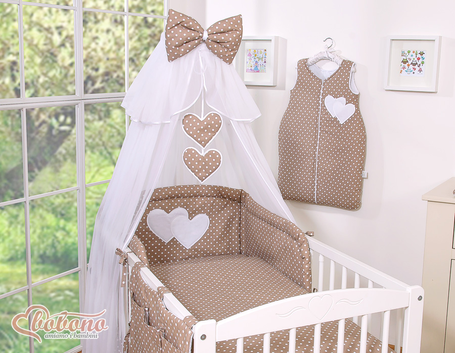 Bedding set 5-pcs bumper cases mosquito-net- Hanging Hearts white dots on brown In the lovingly designed bedding it wonderful to sleep. Skin-friendly quality invites you to dream. Baby bedding set 5pcs with mosquito-net- Collection Hanging Hearts