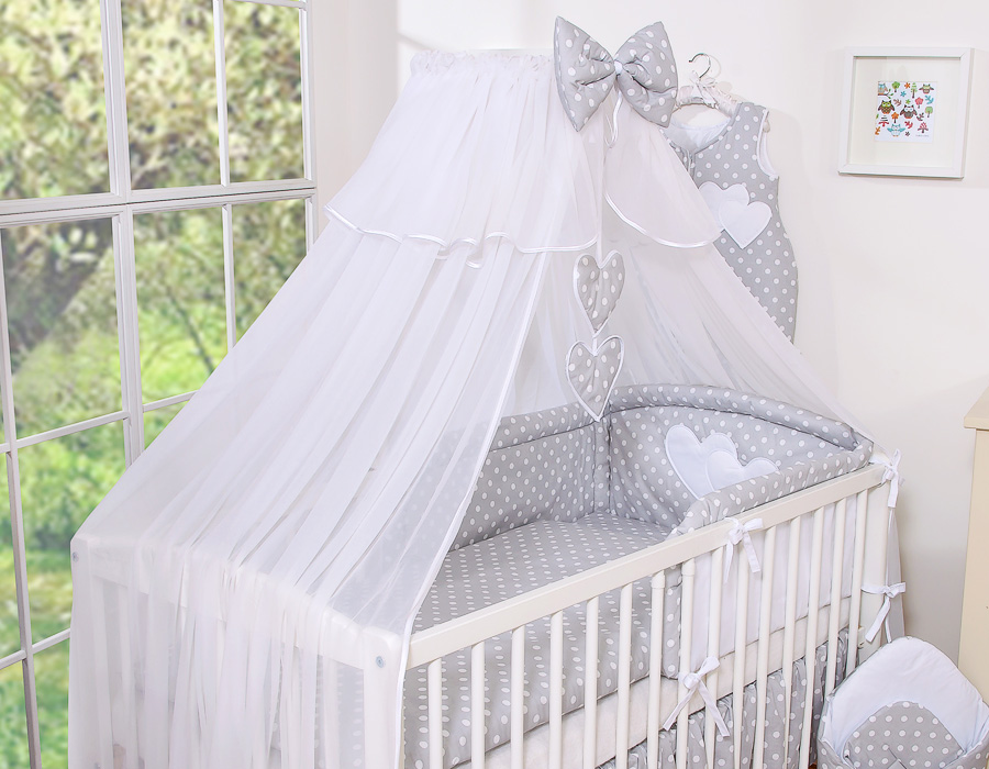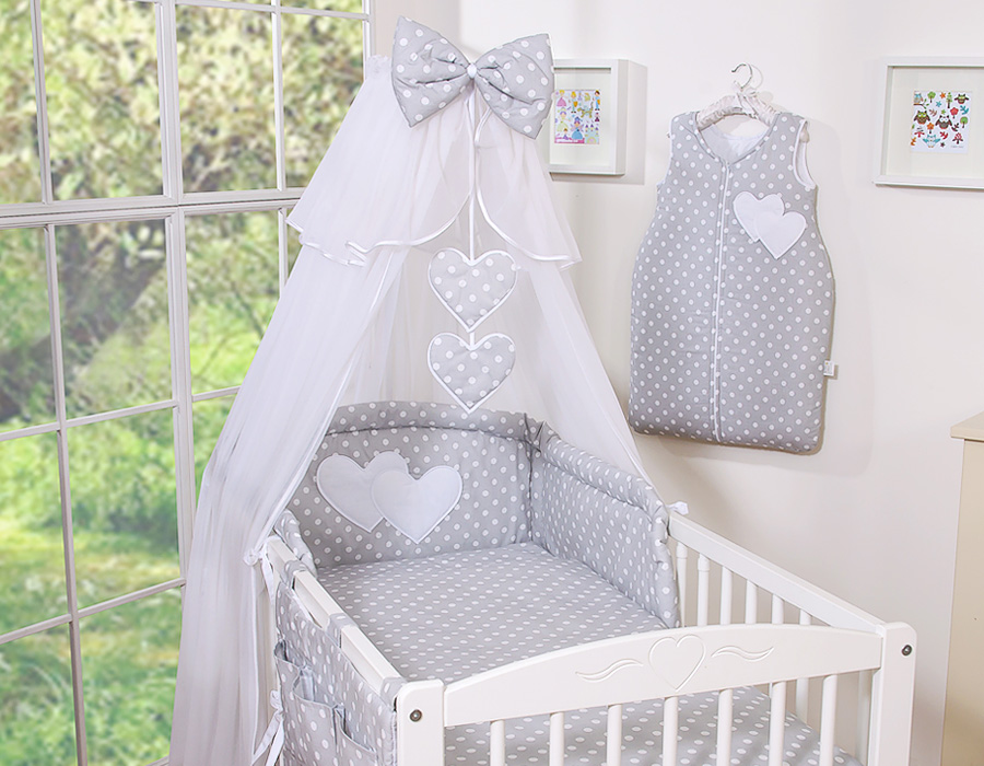 For cot 60x120cm or 140x70cm. Gray On Dots White Hearts Hanging Mosquito-net- Cases Bumper 5-pcs Bedding