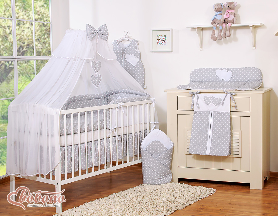Bedding set 5-pcs bumper cases mosquito-net- Hanging Hearts white dots on Gray In the lovingly designed bedding it wonderful to sleep. Skin-friendly quality invites you to dream.