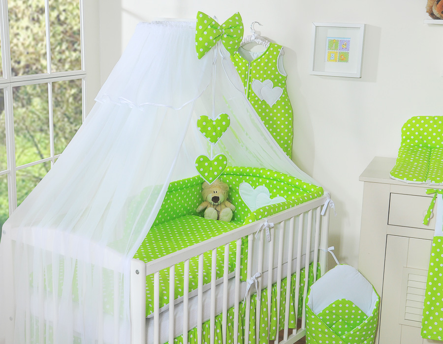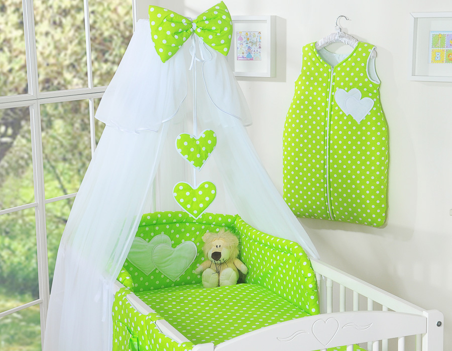 Baby Shop » Bedding sets for cots and beds » Collection HEARTS » Bedding sets for cot 120cm » Bedding set 5-pcs with mosquito-net » Bedding set 5-pcs bumper cases mosquito-net- Hanging Hearts white dots on green