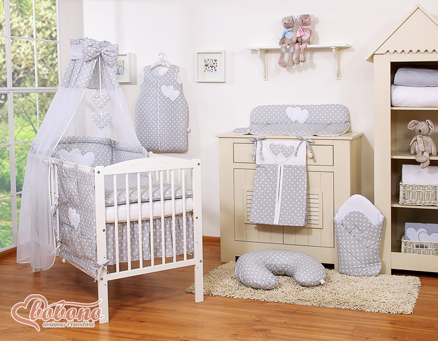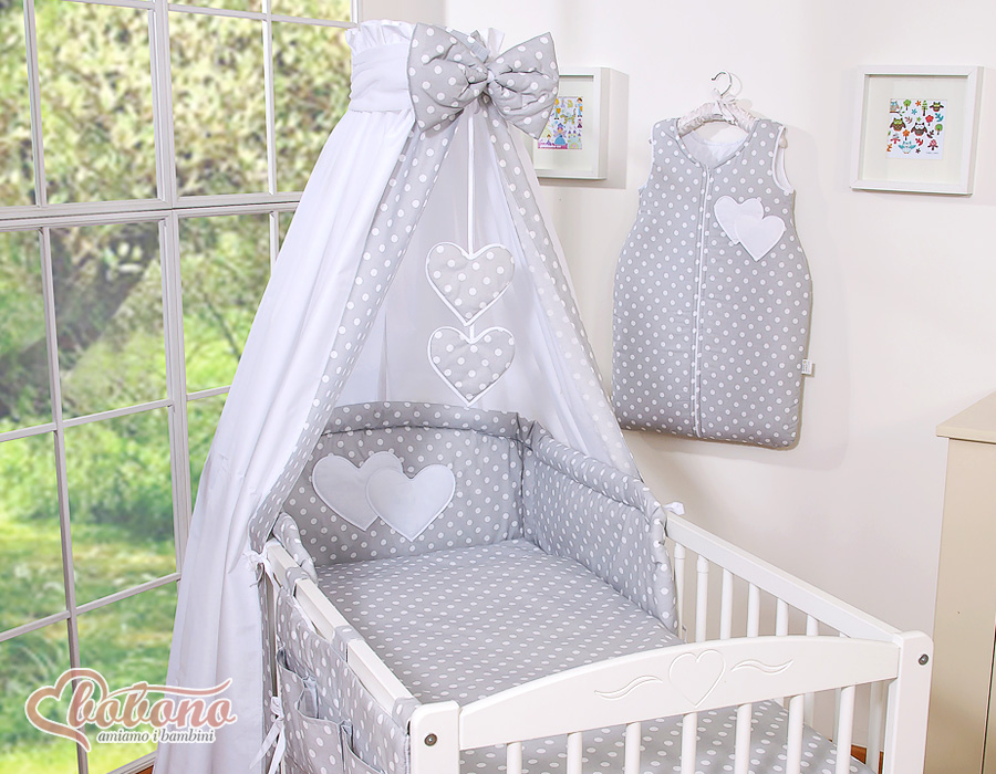 Baby Shop » Bedding sets for cots and beds » Collection HEARTS » Bedding sets for cot 120cm » Bedding set 5-pcs with canopy » Bedding set 5-pcs- Hanging Hearts white dots on Gray