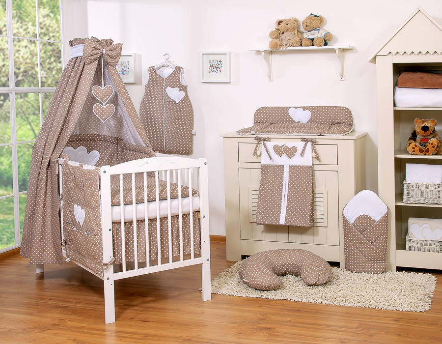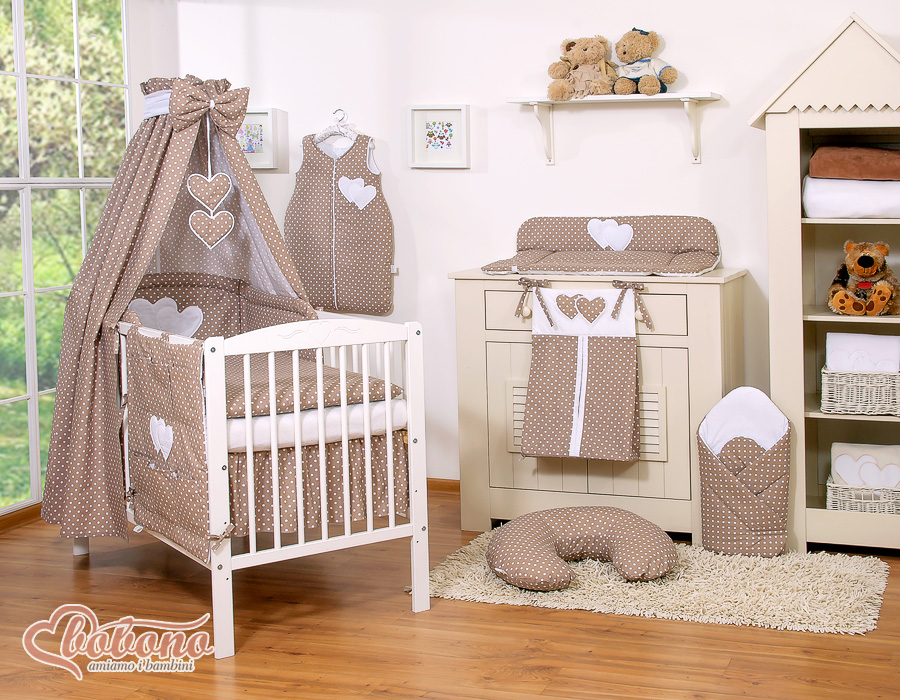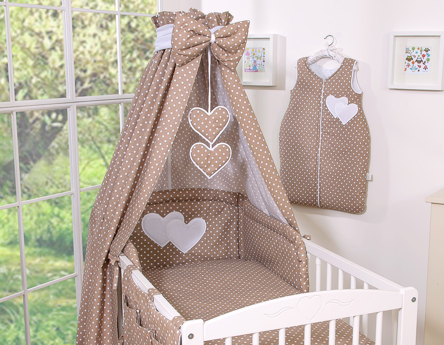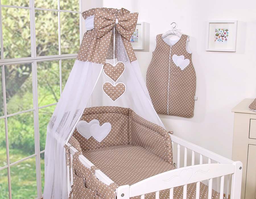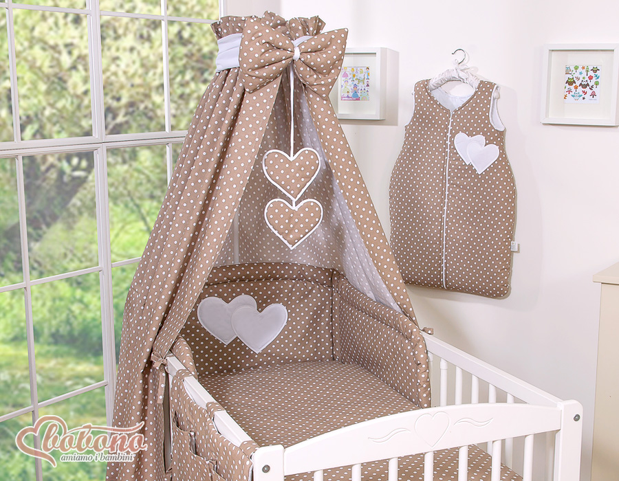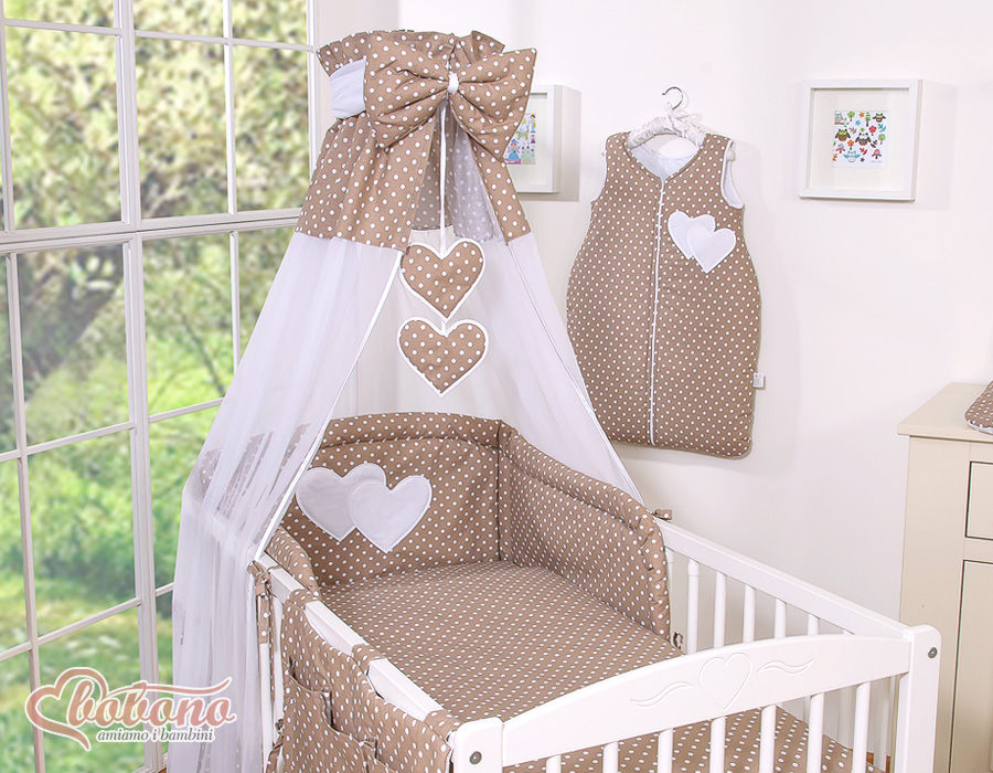 Baby Shop » Bedding sets for cots and beds » Collection HEARTS » Bedding sets for cot 120cm » Bedding set 7-pcs with canopy » Bedding set 7-pcs with canopy- Hanging Hearts white dots on brown