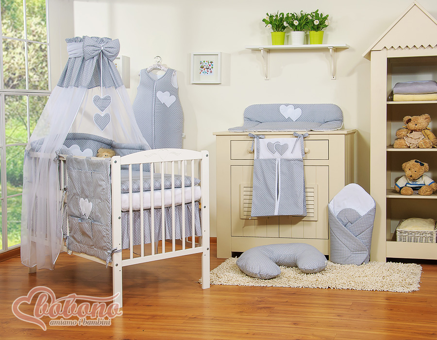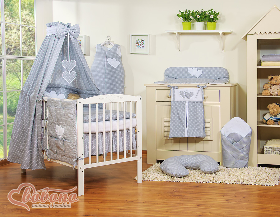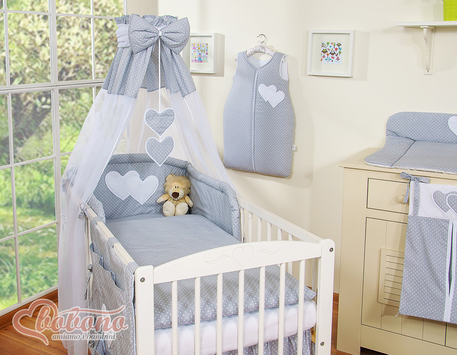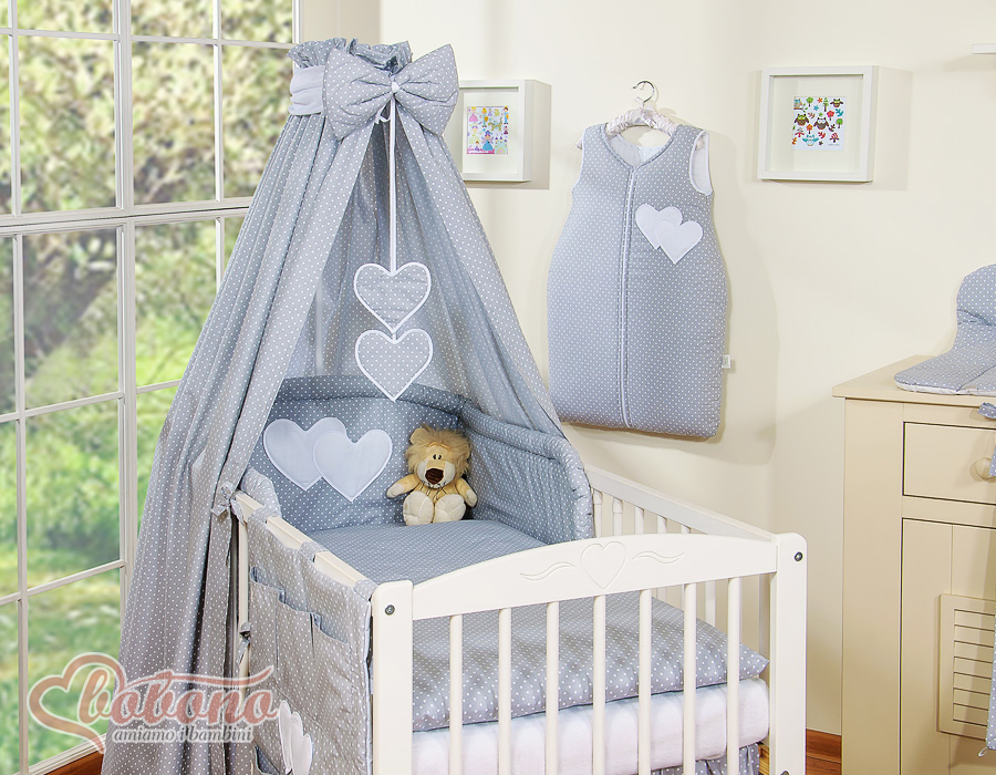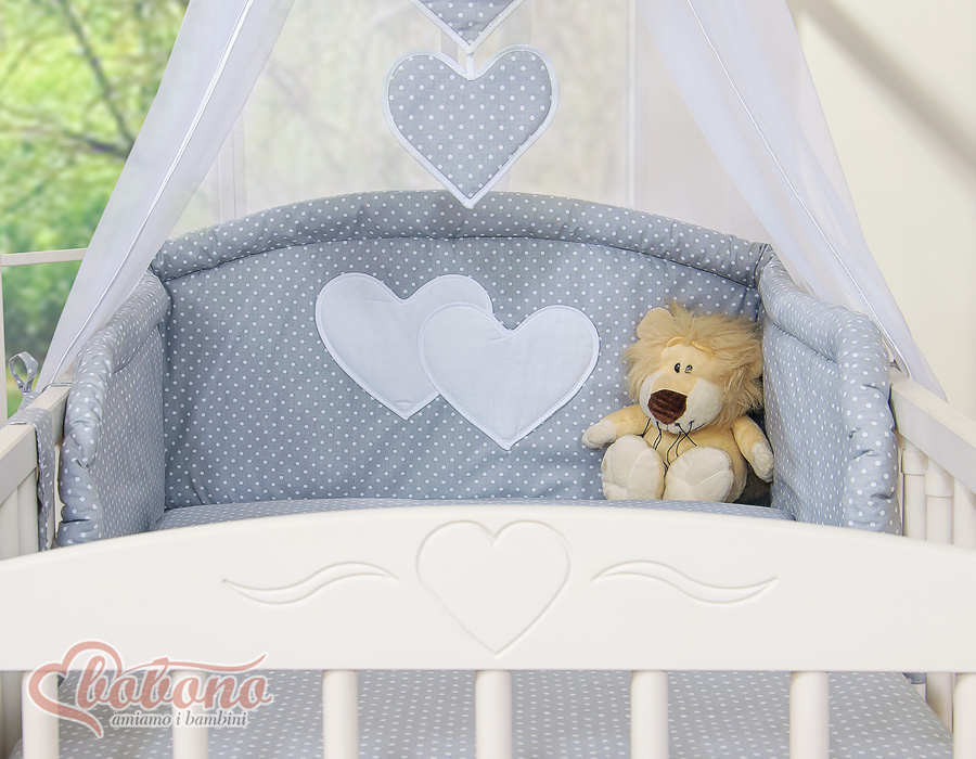 Baby Shop » Bedding sets for cots and beds » Collection HEARTS » Bedding sets for cot 120cm » Bedding set 7-pcs with canopy » Bedding set 7-pcs with canopy- Hanging Hearts white dots on Gray