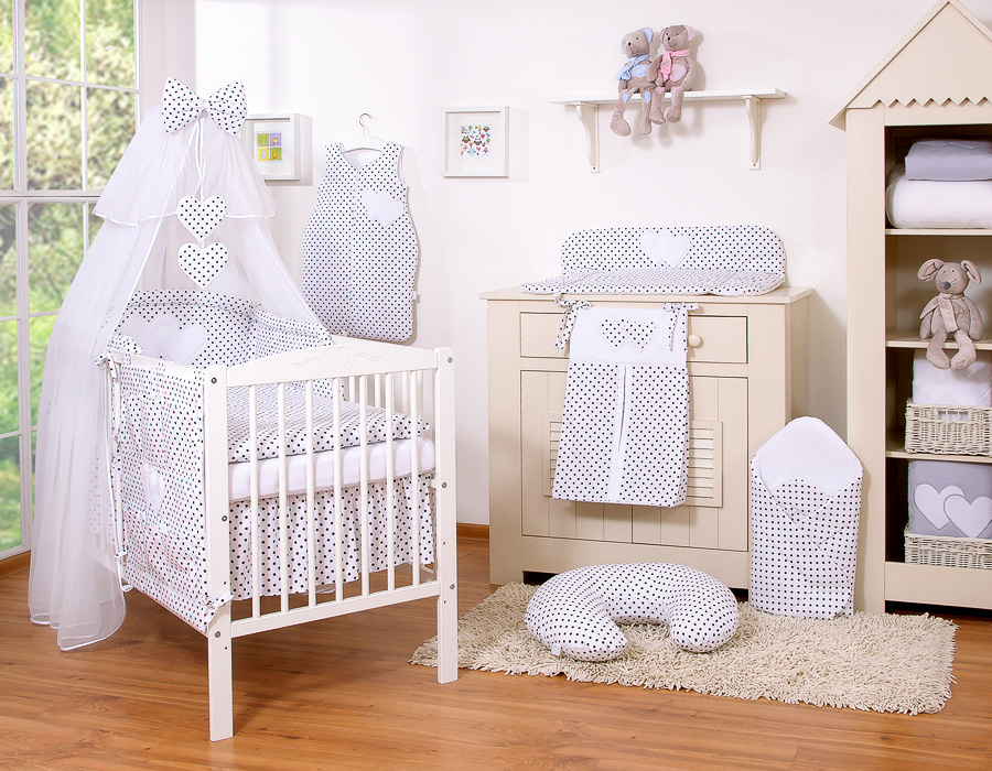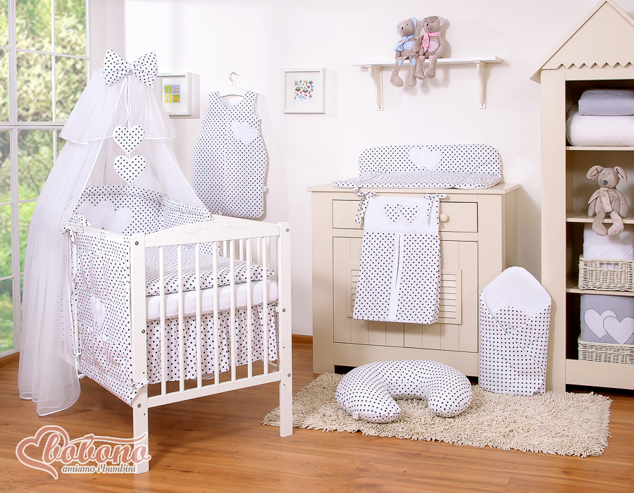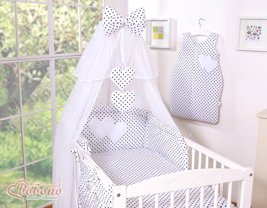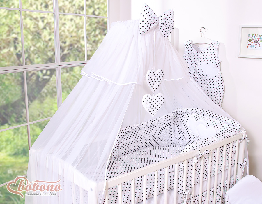 Baby Shop » Bedding sets for cots and beds » Collection HEARTS » Bedding sets for cot 120cm » Bedding set 7-pcs with mosquitonet » Bedding set 7-pcs with mosquito-net- Hanging Hearts black dots on white