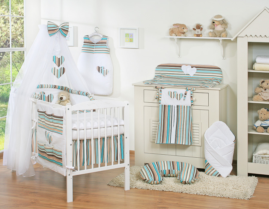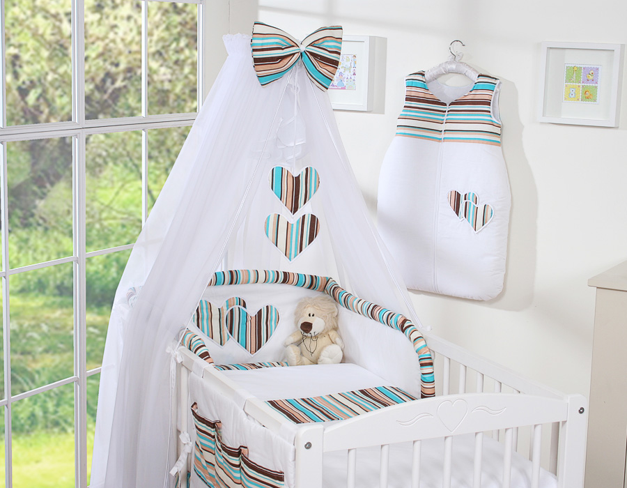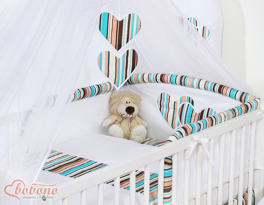 Baby Shop » Bedding sets for cots and beds » Collection HEARTS » Bedding sets for cot 120cm » Bedding set 7-pcs with mosquitonet » Bedding set 7-pcs with mosquito-net- Hanging Hearts brown stripes