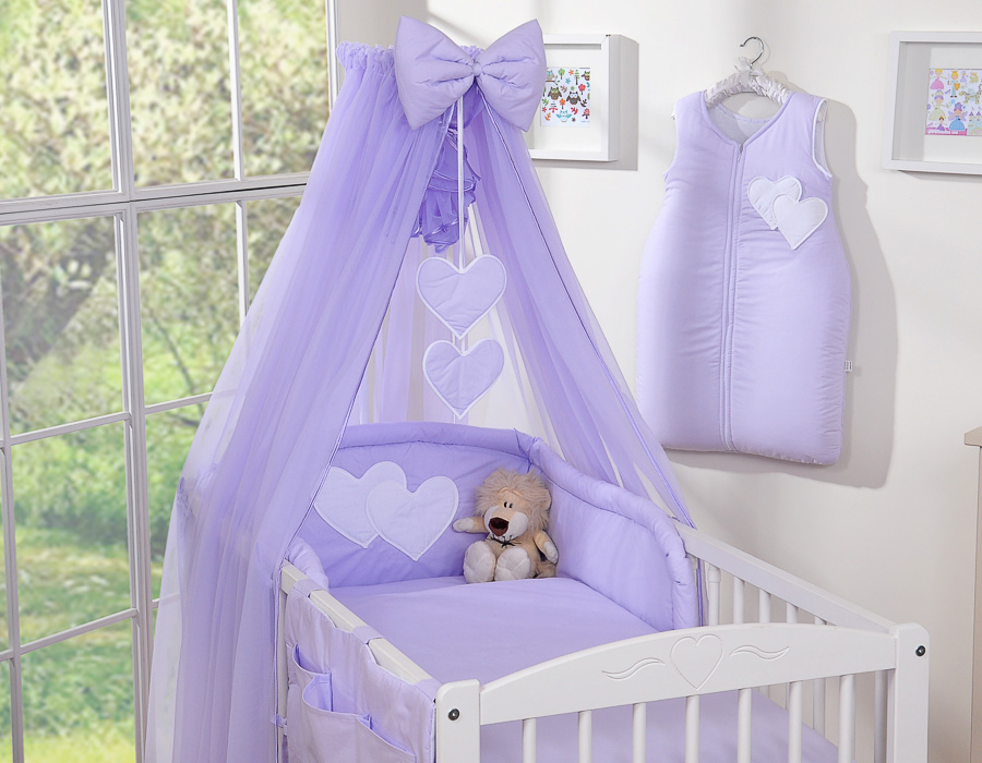 Baby Shop » Bedding sets for cots and beds » Collection HEARTS » Bedding sets for cot 120cm » Bedding set 7-pcs with mosquitonet » Bedding set 7-pcs with mosquito-net- Hanging Hearts lilac