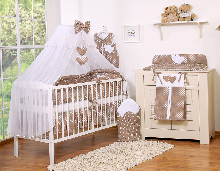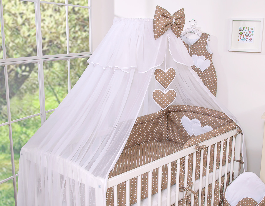 Bedding set 7-pcs with mosquito-net- Hanging Hearts white dots on brown In the lovingly designed bedding it wonderful to sleep. Skin-friendly quality invites you to dream.