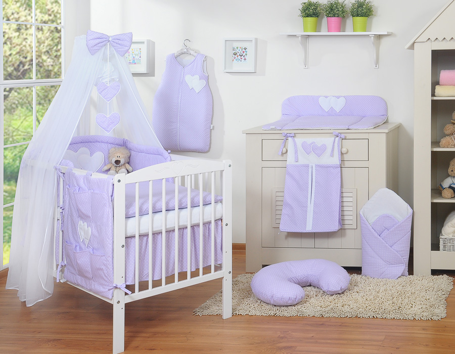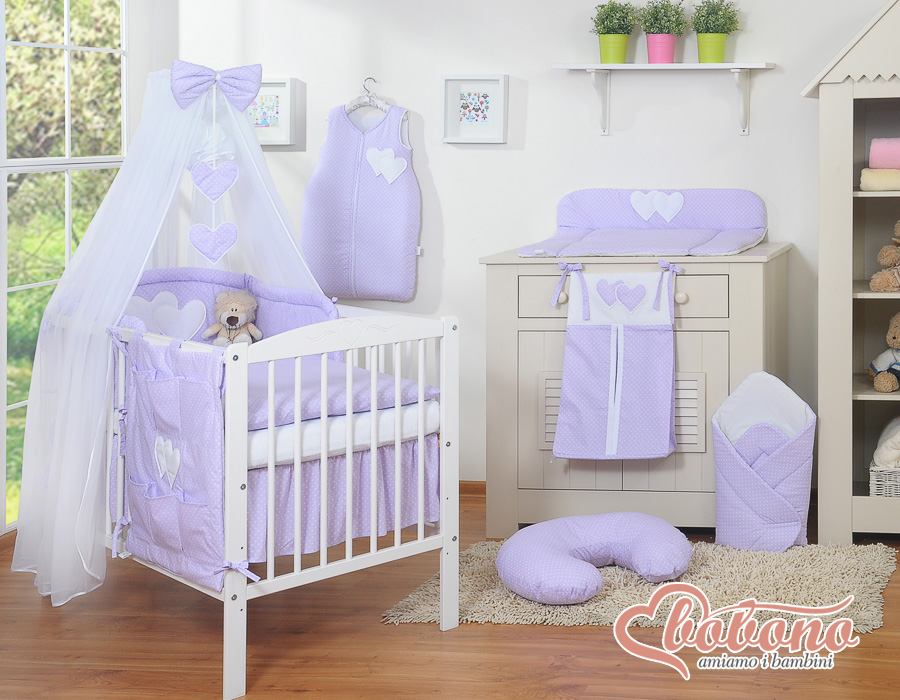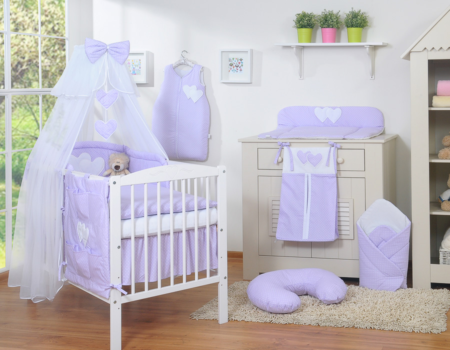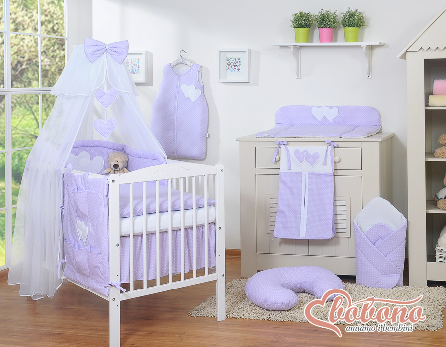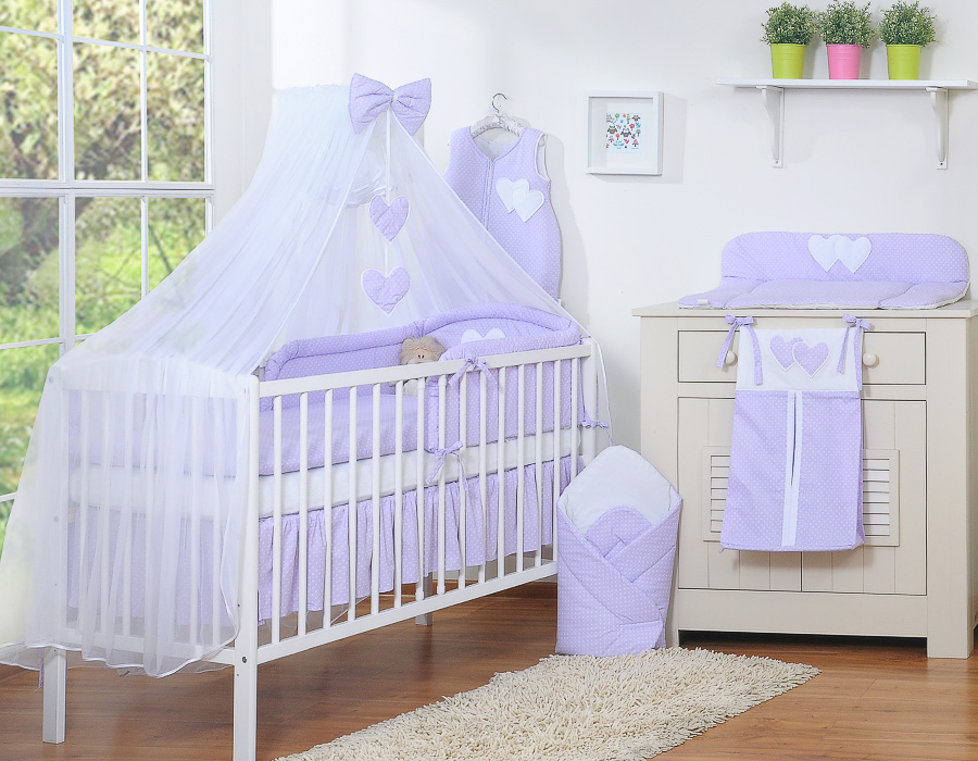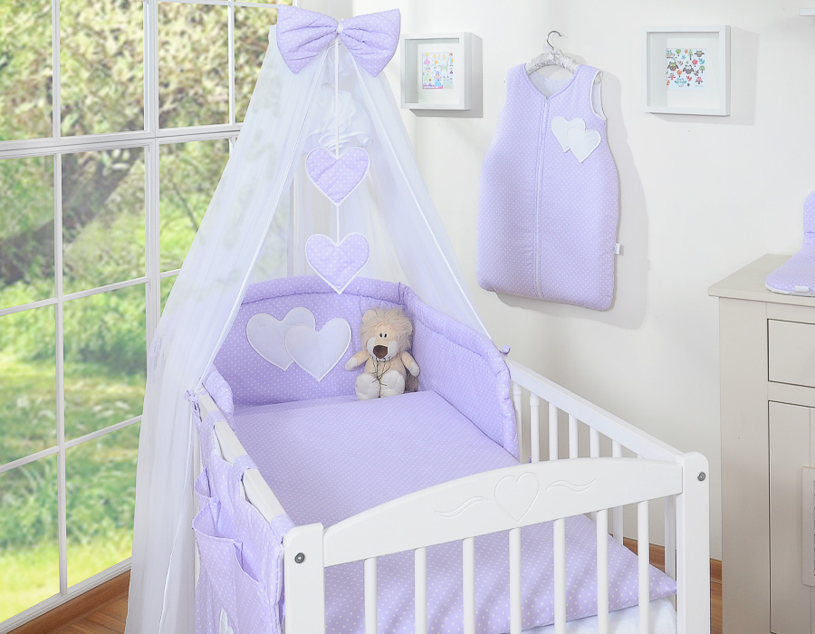 Baby Shop » Bedding sets for cots and beds » Collection HEARTS » Bedding sets for cot 120cm » Bedding set 7-pcs with mosquitonet » Bedding set 7-pcs with mosquito-net- Hanging Hearts white polka dots on lilac