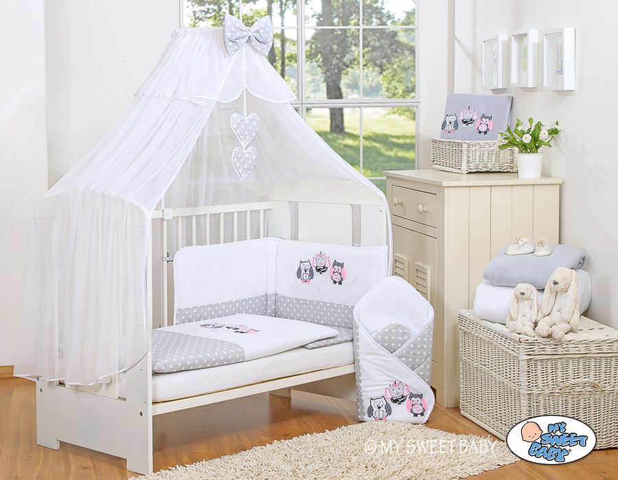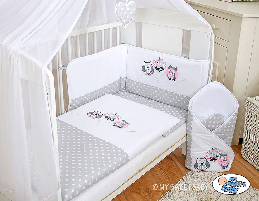 Bedding set 7-pcs with mosquito-net- Owls Gray-pink Bedding set 7 pcs with filling- Collection Owls Bigi Zibi & Adele