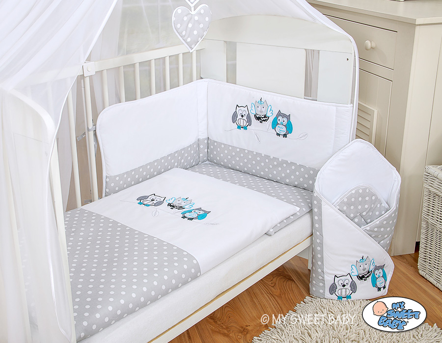 Bedding set 7-pcs with mosquito-net- Owls Gray-turquoise Bedding set 7 pcs with filling- Collection Owls Bigi Zibi & Adele