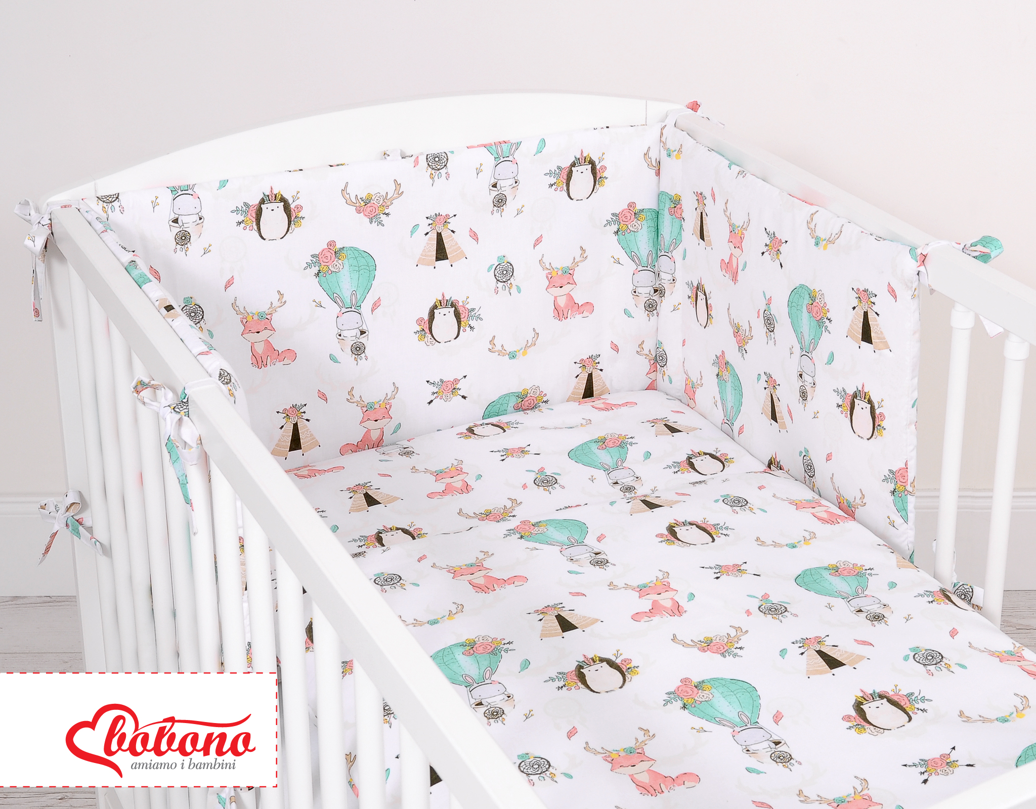 The set fits to baby cot 120x60cm or 140x70cm.
