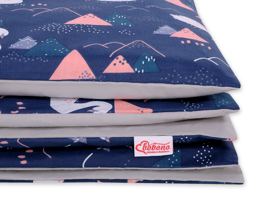 2. Double-sided quilt cover 120x90cm or 135x100cm. Made of 100% cotton fabric, certified Oeko-tex Standard 100. Pillow fastened with a indoor zip, which facilitates a quick change of bedding.