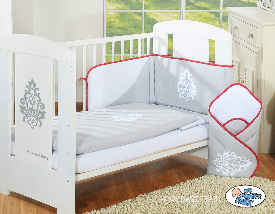 1. Pillow slip 40x60cm. Made of 100% Cotton. 2. Duvet cover 100x135cm. Made of 100% cotton. 3. Universal bumper 40x180cm.Outer fabric 100% Cotton, padding 100% Polyester. Perfect fit for both size of cots: 60x120cm and 70x140cm. For cot 60x120cm and 70x140cm. Gray-red Glamour 3-pcs- Cot Baby For Bedding