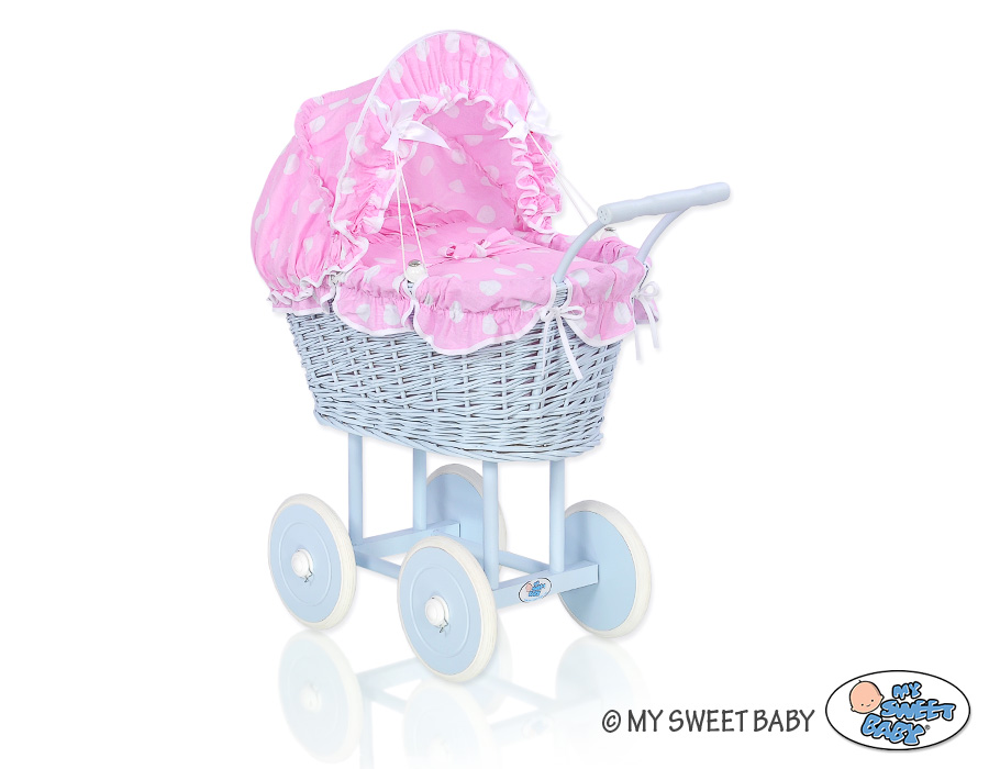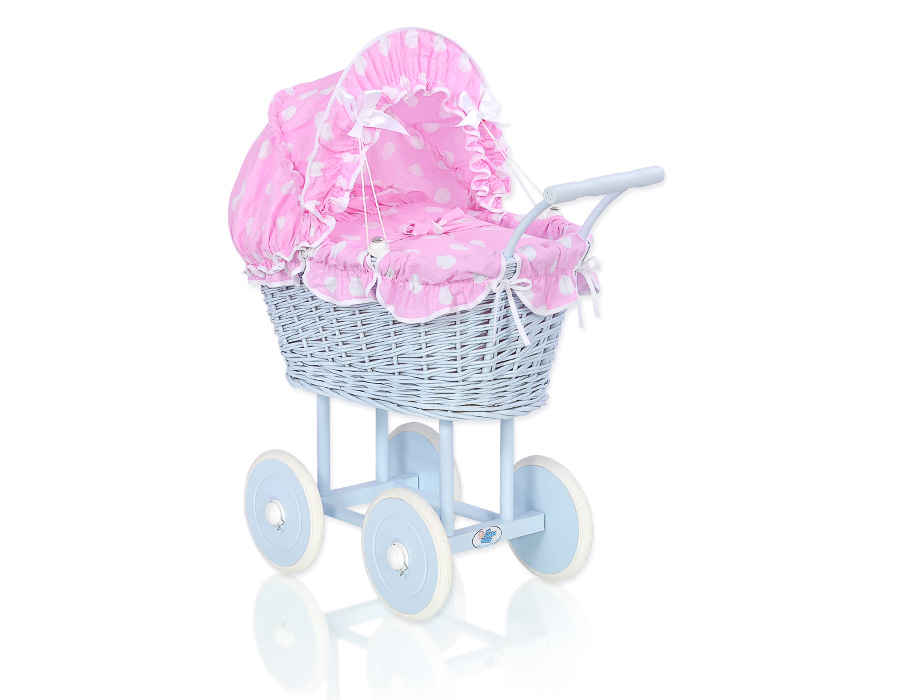 Baby Shop » Baby Toys » Doll prams » Wicker Doll prams » Blue Wicker Dolls Prams » Blue Wicker Stroller Doll pram Pink with Big White Dots Bedding Set