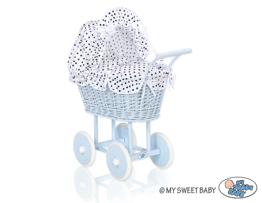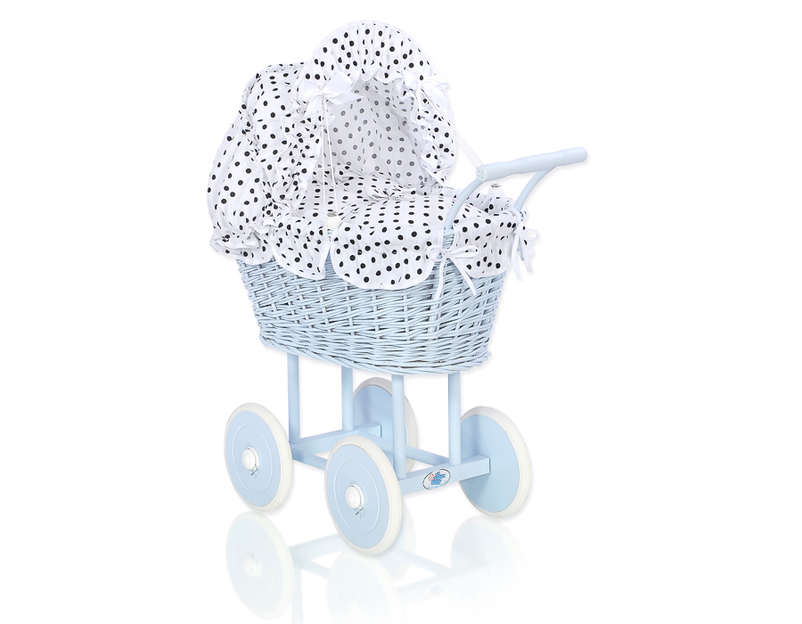 Baby Shop » Baby Toys » Doll prams » Wicker Doll prams » Blue Wicker Dolls Prams » Blue Wicker Stroller Doll pram White with Black Dots Bedding Set