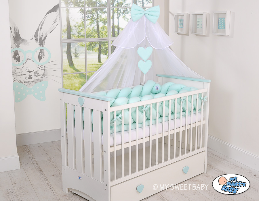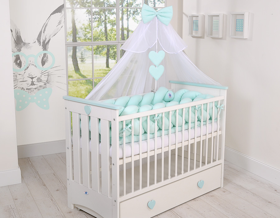 This knottted bumper protects your baby's hands and feet from getting stuck between the spindles as well as it protects the baby's head and body from hitting against the cot walls. With the included cotton bows, the bumper can be fixed to the bars.