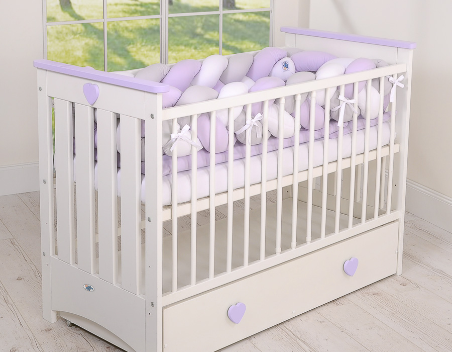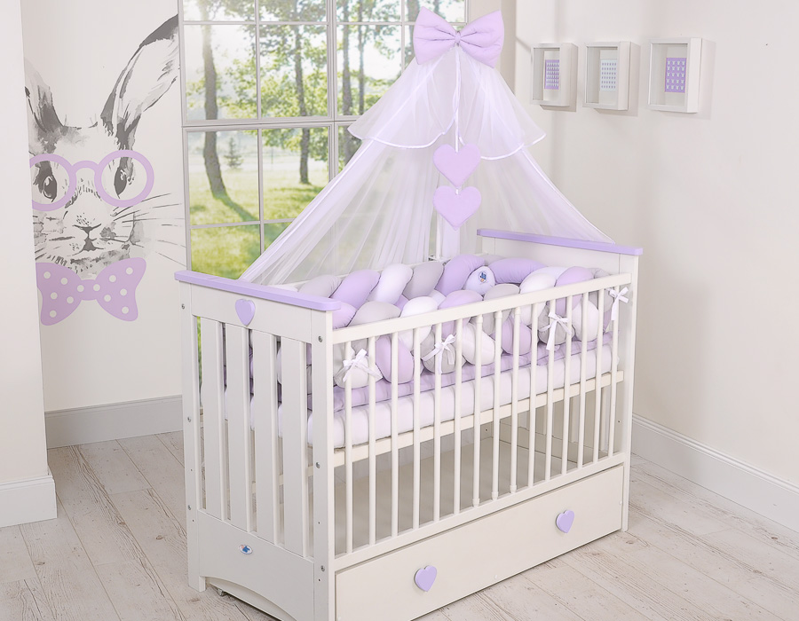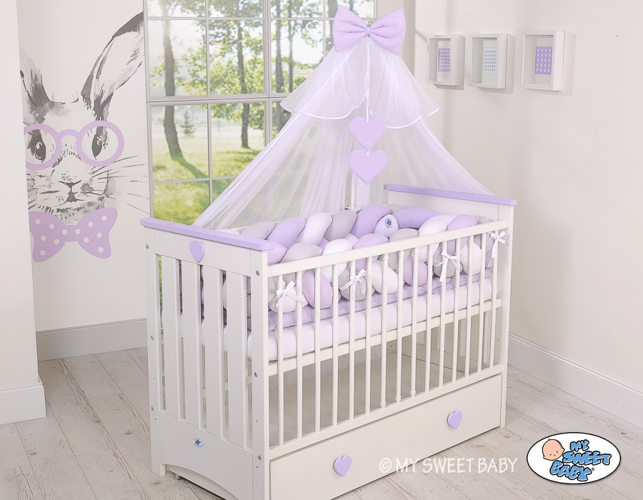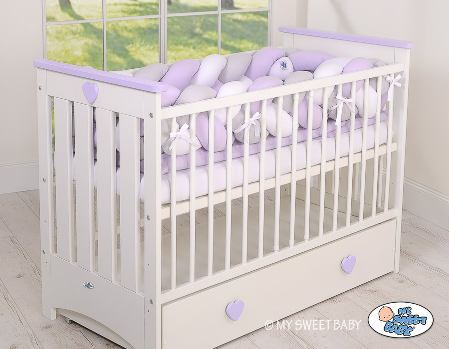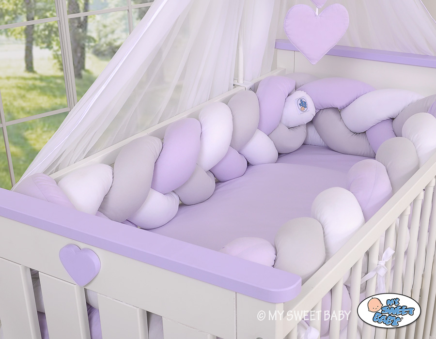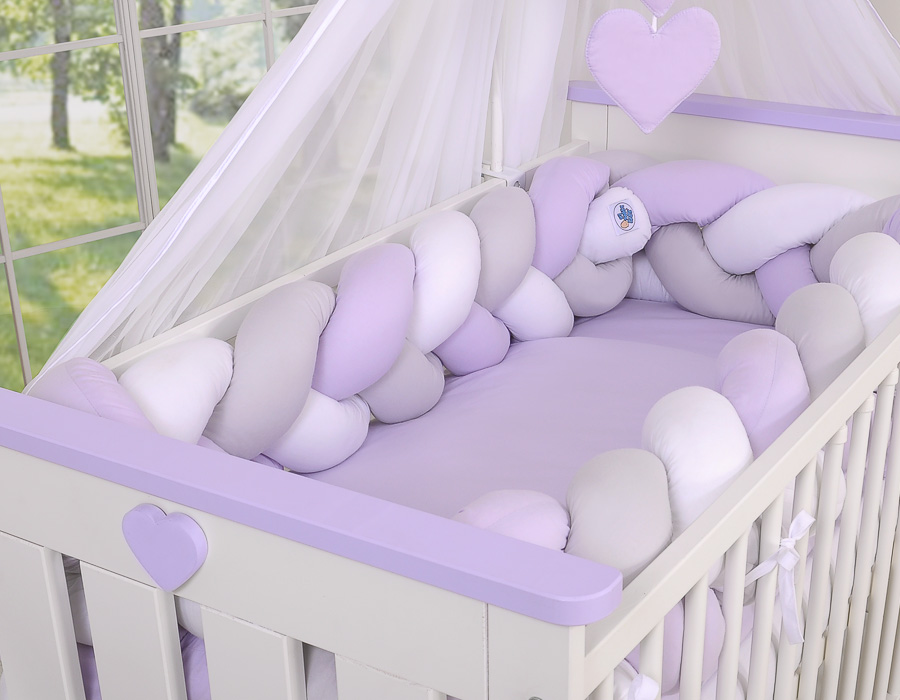 Braided Cushion Extra Long Thick Knot bumper XXL Pillow- white-gray-lilac Beautiful, very soft braided cot bumper made from 100% cotton. Can be fixed to the bars.