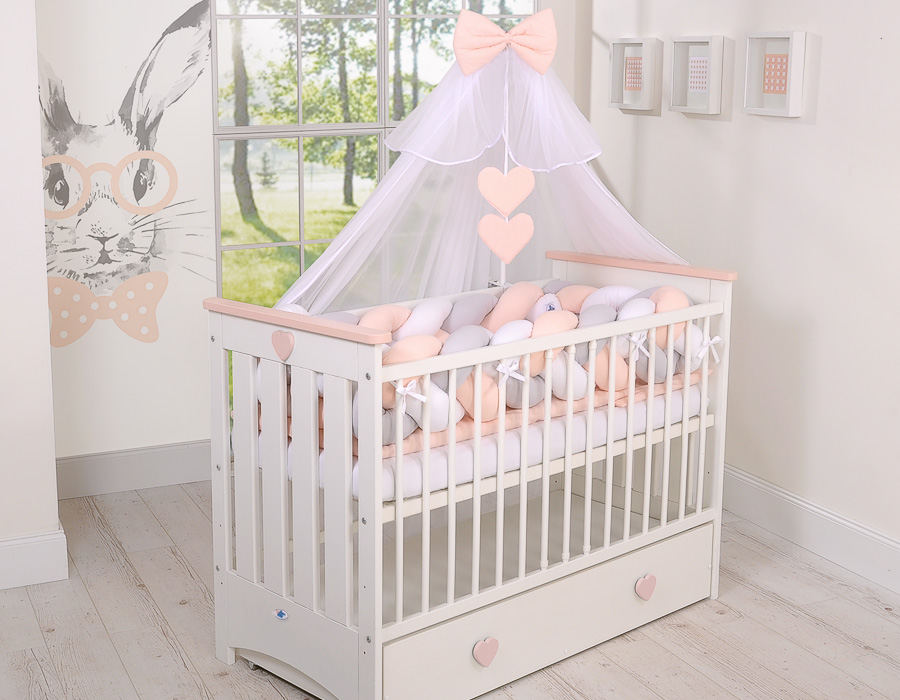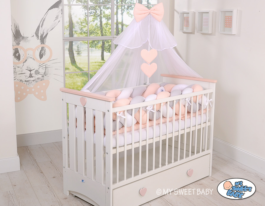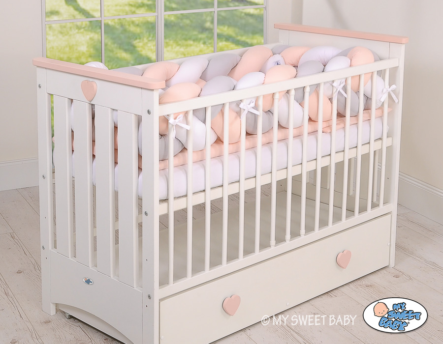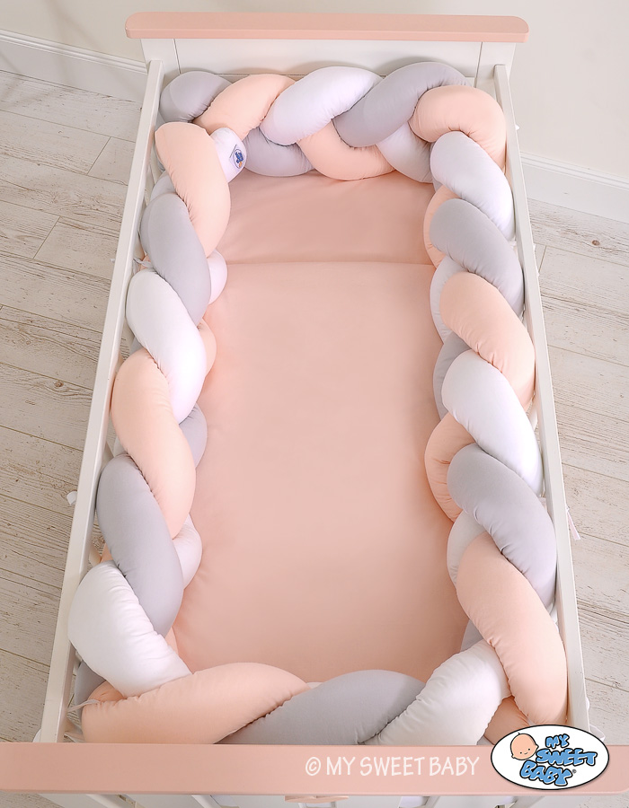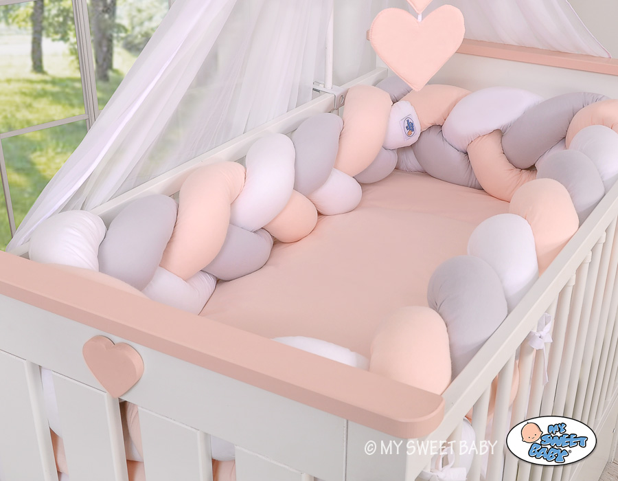 Braided Cushion Extra Thick Knot bumper 3m XXL Pillow- white-gray - powder pink Beautiful, very soft braided cot bumper made from 100% cotton. Can be fixed to the bars.