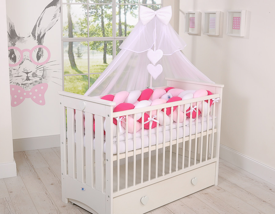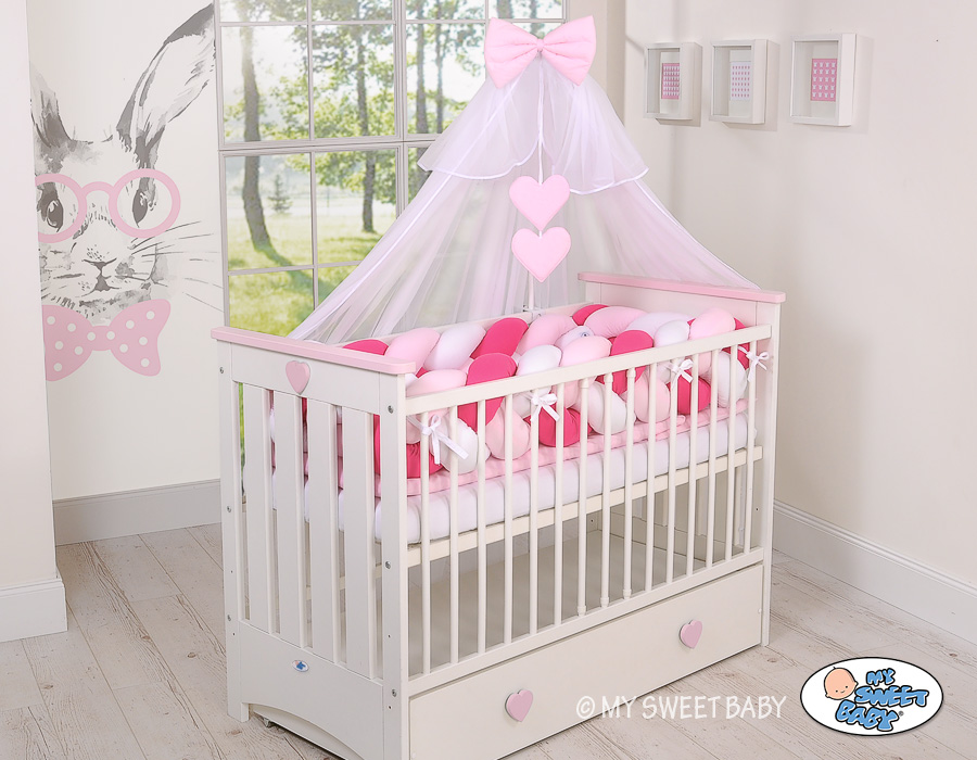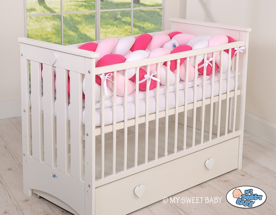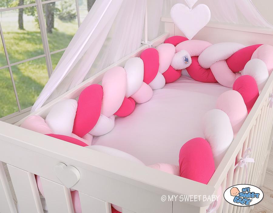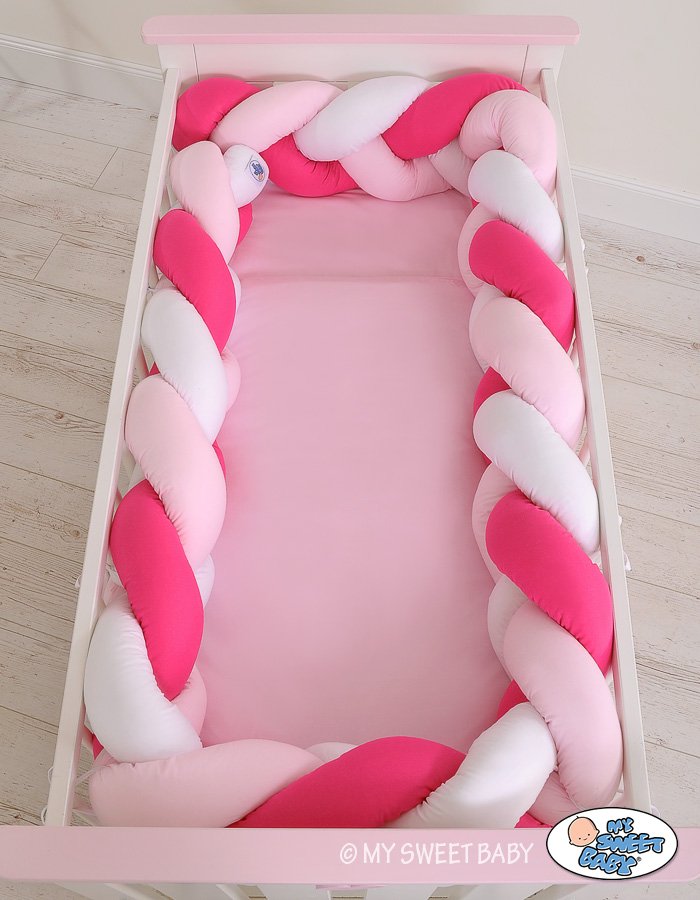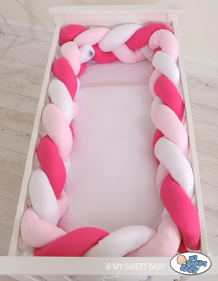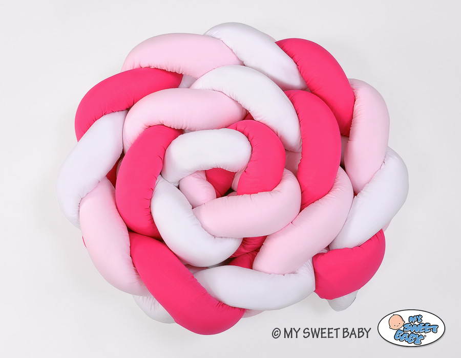 Braided Cushion Extra Thick Long High Knot bumper XXL Pillow- white-dark pink-pink Beautiful, very soft braided cot bumper made from 100% cotton. Can be fixed to the bars.