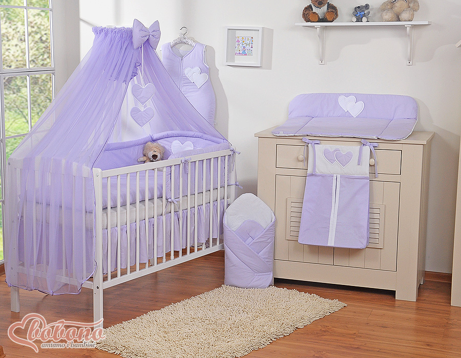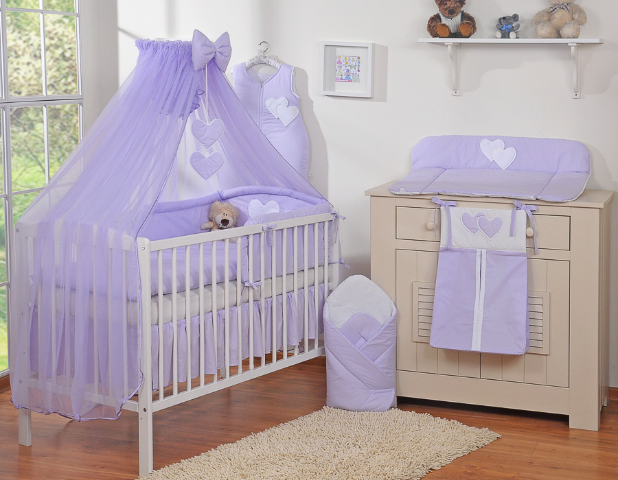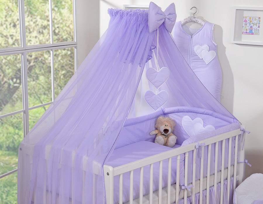 Cotbed Bedding set 5-pcs with mosquito-net- Hanging Hearts lilac In the lovingly designed bedding it wonderful to sleep. Skin-friendly quality invites you to dream.