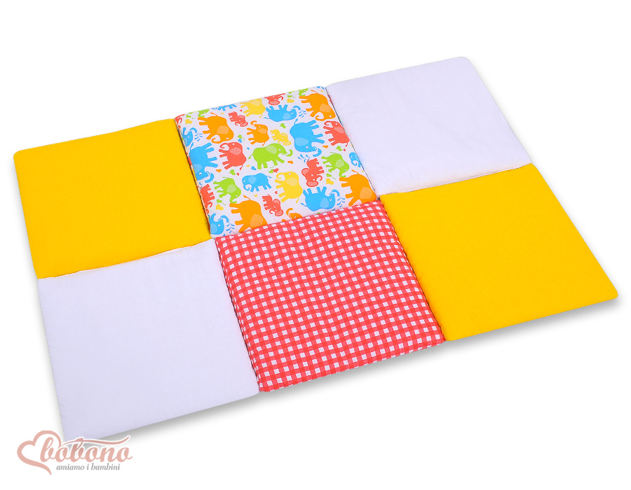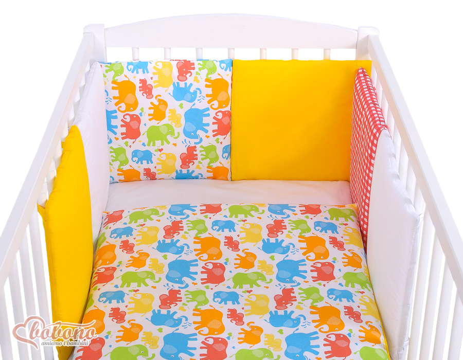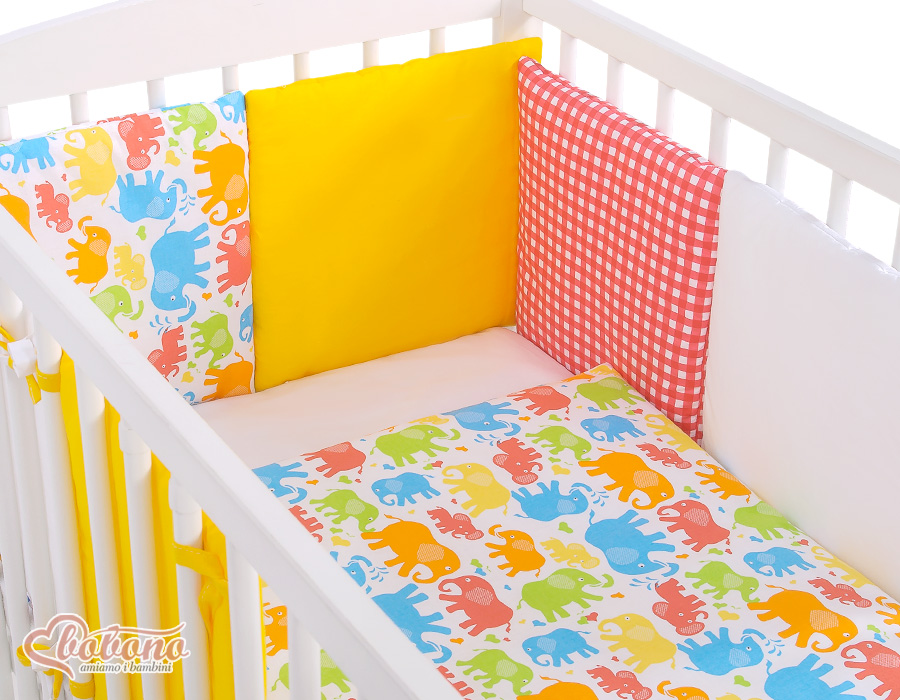 3-8. Universal bumper 6pcs- the bumper is made of 6 pillows filled with a special non-allergic and breathable silicone Filling (certified OKOTEX). The size of one pillow is 32cm x 32cm. Cover of the bumper or made of 100% cotton. Pillows have fastening strips to match them each other. You can match the pillows in any order. It is a perfect decoration of baby cot. If we match every pillows together the bumper can be used as a playing mat for baby.