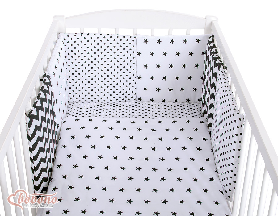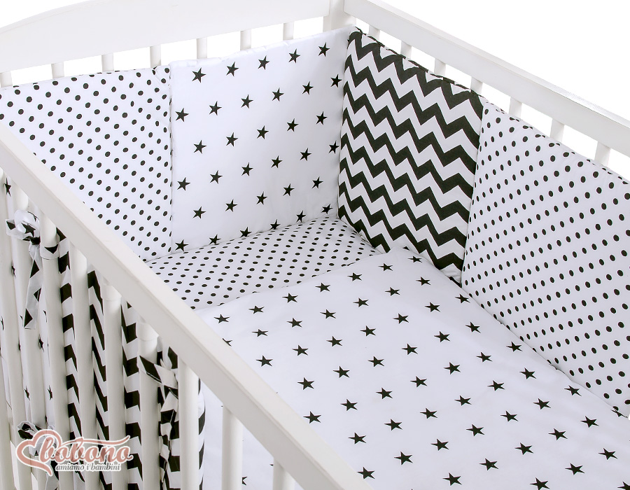 3-8. Universal bumper 6pcs- the bumper is made of 6 pillows filled with a special non-allergic and breathable silicone Filling (certified OKOTEX). The size of one pillow is 32cm x 32cm. Cover of the bumper or made of 100% cotton. Pillows have fastening strips to match them each other. You can match the pillows in any order. It is a perfect decoration of baby cot. If we match every pillows together the bumper can be used as a playing mat for baby.