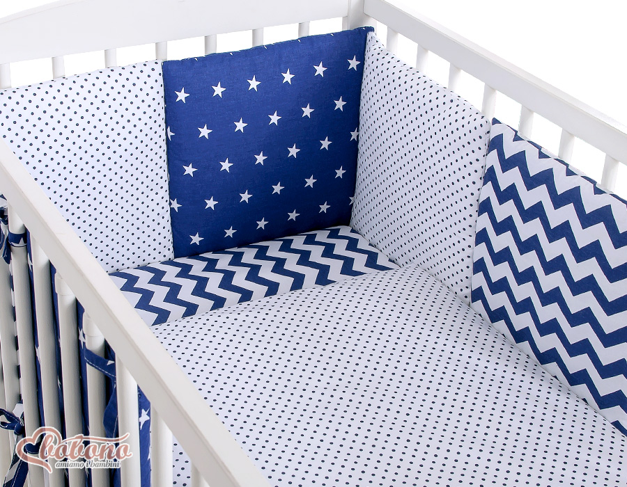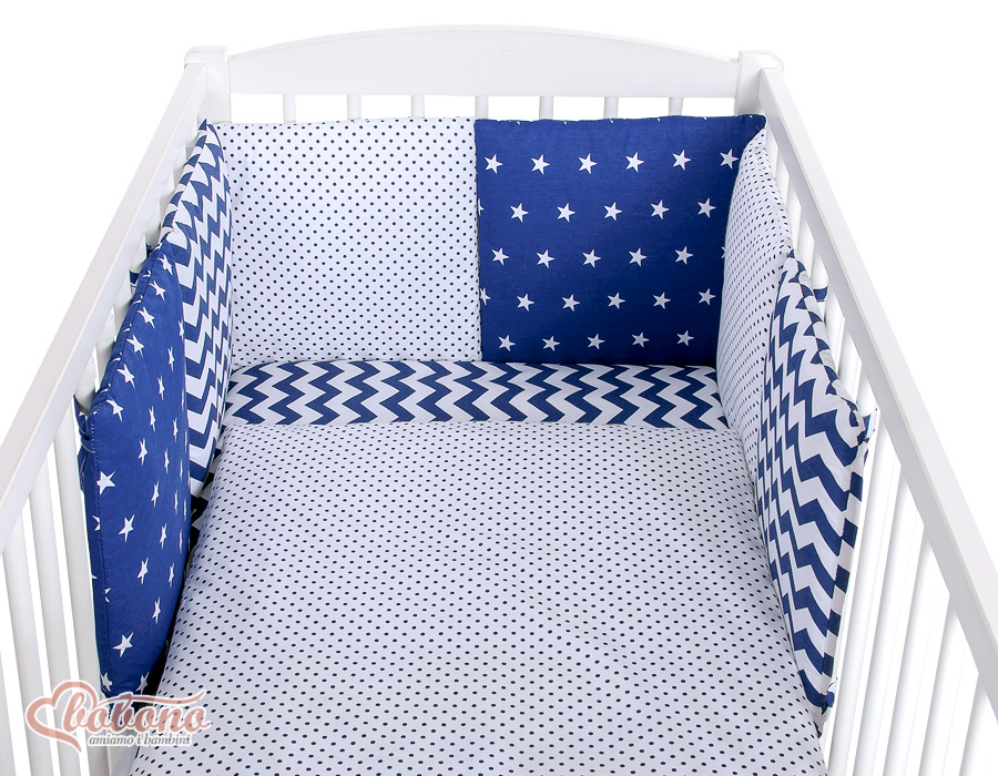 3-8. Universal bumper 6pcs- the bumper is made of 6 pillows filled with a special non-allergic and breathable silicone Filling (certified OKOTEX). The size of one pillow is 32cm x 32cm. Cover of the bumper or made of 100% cotton. Pillows have fastening strips to match them each other. You can match the pillows in any order. It is a perfect decoration of baby cot. If we match every pillows together the bumper can be used as a playing mat for baby.