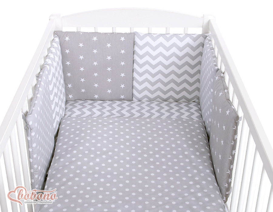 3-8. Universal bumper 6pcs- the bumper is made of 6 pillows filled with a special non-allergic and breathable silicone Filling (certified OKOTEX). The size of one pillow is 32cm x 32cm. Cover of the bumper or made of 100% cotton. Pillows have fastening strips to match them each other. You can match the pillows in any order. It is a perfect decoration of baby cot. If we match every pillows together the bumper can be used as a playing mat for baby.