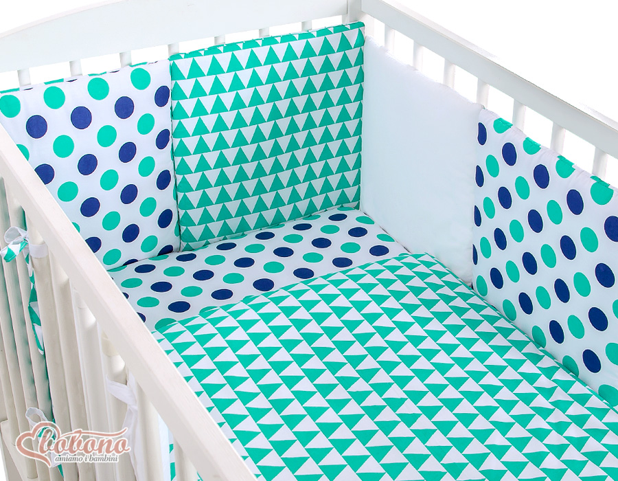 3-8. Universal bumper 6pcs- the bumper is made of 6 pillows filled with a special non-allergic and breathable silicone Filling (certified OKOTEX). The size of one pillow is 32cm x 32cm. Cover of the bumper or made of 100% cotton. Pillows have fastening strips to match them each other. You can match the pillows in any order. It is a perfect decoration of baby cot. If we match every pillows together the bumper can be used as a playing mat for baby.