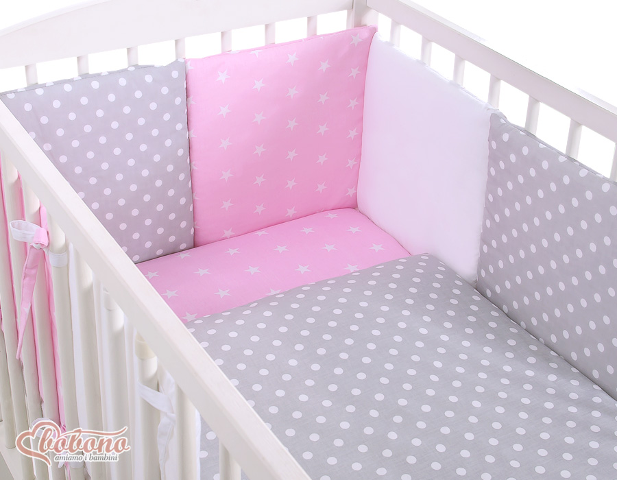 3-8. Universal bumper 6pcs- the bumper is made of 6 pillows filled with a special non-allergic and breathable silicone Filling (certified OKOTEX). The size of one pillow is 32cm x 32cm. Cover of the bumper or made of 100% cotton. Pillows have fastening strips to match them each other. You can match the pillows in any order. It is a perfect decoration of baby cot. If we match every pillows together the bumper can be used as a playing mat for baby.