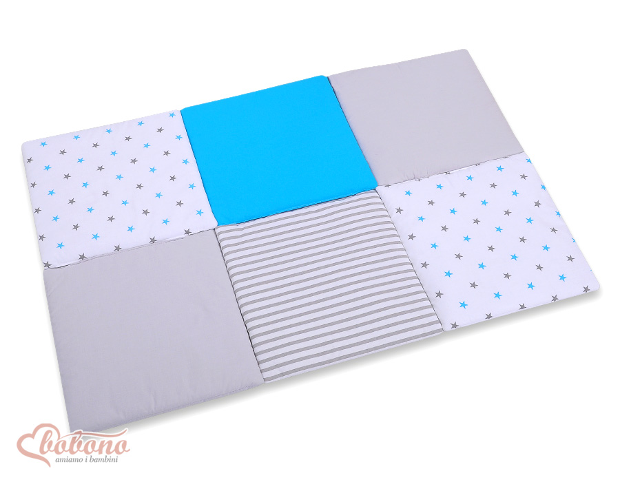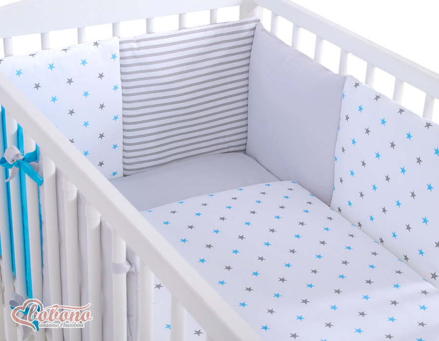 3-8. Universal bumper 6pcs- the bumper is made of 6 pillows filled with a special non-allergic and breathable silicone Filling (certified OKOTEX). The size of one pillow is 32cm x 32cm. Cover of the bumper or made of 100% cotton. Pillows have fastening strips to match them each other. You can match the pillows in any order. It is a perfect decoration of baby cot. If we match every pillows together the bumper can be used as a playing mat for baby.