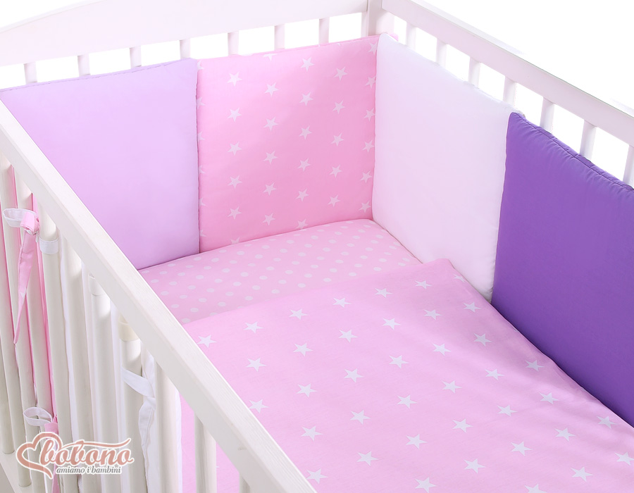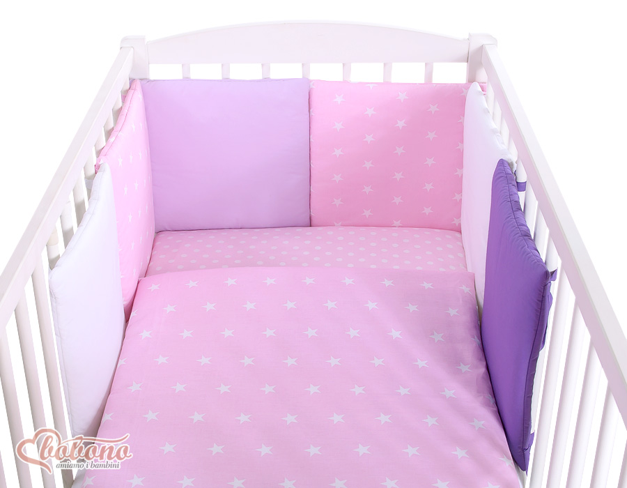 3-8. Universal bumper 6pcs- the bumper is made of 6 pillows filled with a special non-allergic and breathable silicone Filling (certified OKOTEX). The size of one pillow is 32cm x 32cm. Cover of the bumper or made of 100% cotton. Pillows have fastening strips to match them each other. You can match the pillows in any order. It is a perfect decoration of baby cot. If we match every pillows together the bumper can be used as a playing mat for baby.