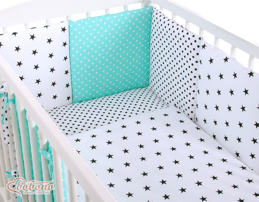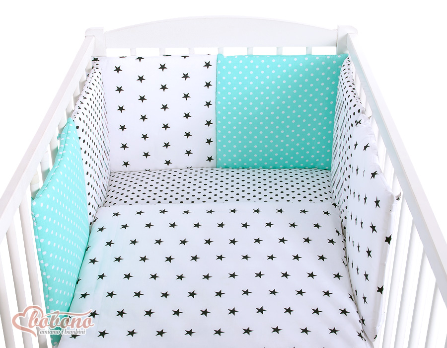 3-8. Universal bumper 6pcs- the bumper is made of 6 pillows filled with a special non-allergic and breathable silicone Filling (certified OKOTEX). The size of one pillow is 32cm x 32cm. Cover of the bumper or made of 100% cotton. Pillows have fastening strips to match them each other. You can match the pillows in any order. It is a perfect decoration of baby cot. If we match every pillows together the bumper can be used as a playing mat for baby.