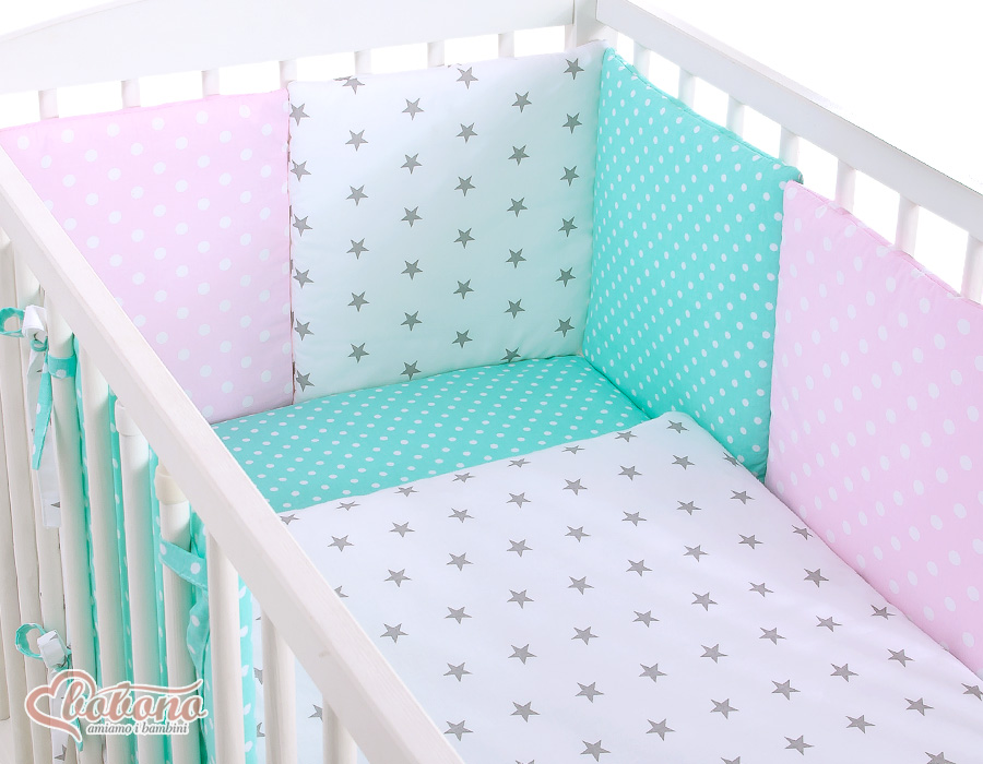 3-8. Universal bumper 6pcs- the bumper is made of 6 pillows filled with a special non-allergic and breathable silicone Filling (certified OKOTEX). The size of one pillow is 32cm x 32cm. Cover of the bumper or made of 100% cotton. Pillows have fastening strips to match them each other. You can match the pillows in any order. It is a perfect decoration of baby cot. If we match every pillows together the bumper can be used as a playing mat for baby.