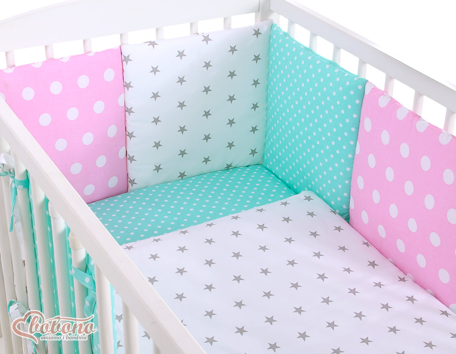 3-8. Universal bumper 6pcs- the bumper is made of 6 pillows filled with a special non-allergic and breathable silicone Filling (certified OKOTEX). The size of one pillow is 32cm x 32cm. Cover of the bumper or made of 100% cotton. Pillows have fastening strips to match them each other. You can match the pillows in any order. It is a perfect decoration of baby cot. If we match every pillows together the bumper can be used as a playing mat for baby.