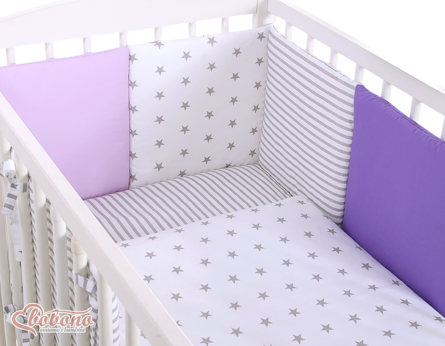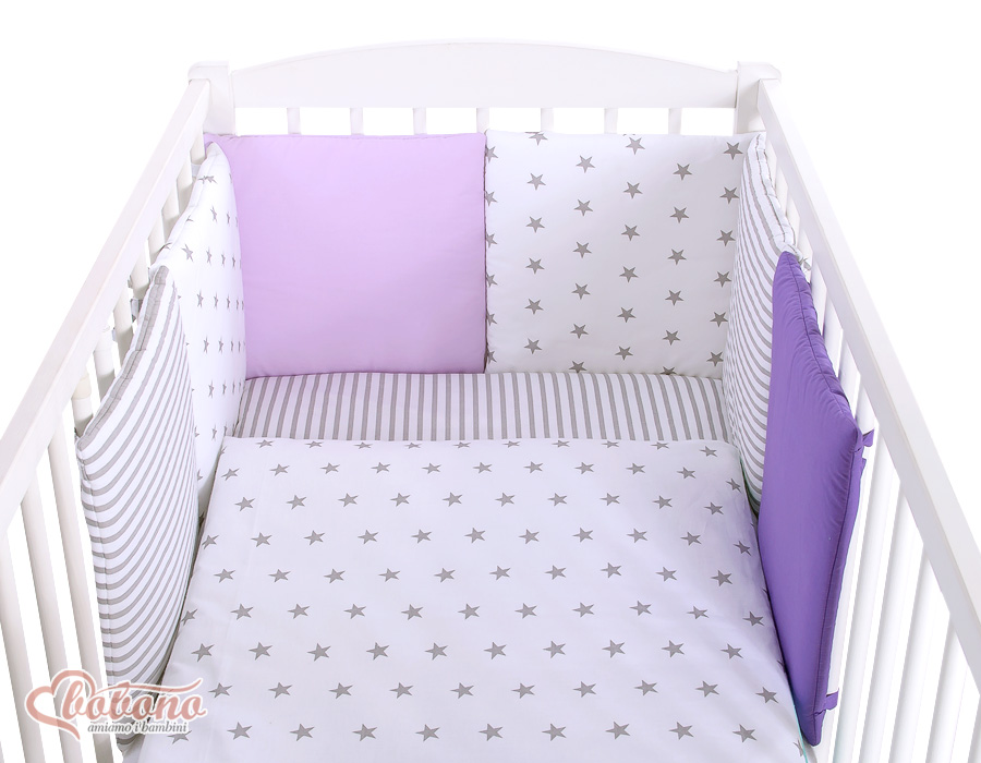 3-8. Universal bumper 6pcs- the bumper is made of 6 pillows filled with a special non-allergic and breathable silicone Filling (certified OKOTEX). The size of one pillow is 32cm x 32cm. Cover of the bumper or made of 100% cotton. Pillows have fastening strips to match them each other. You can match the pillows in any order. It is a perfect decoration of baby cot. If we match every pillows together the bumper can be used as a playing mat for baby.