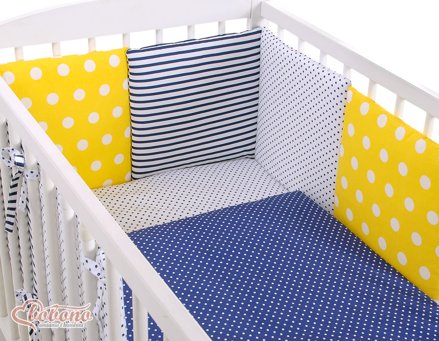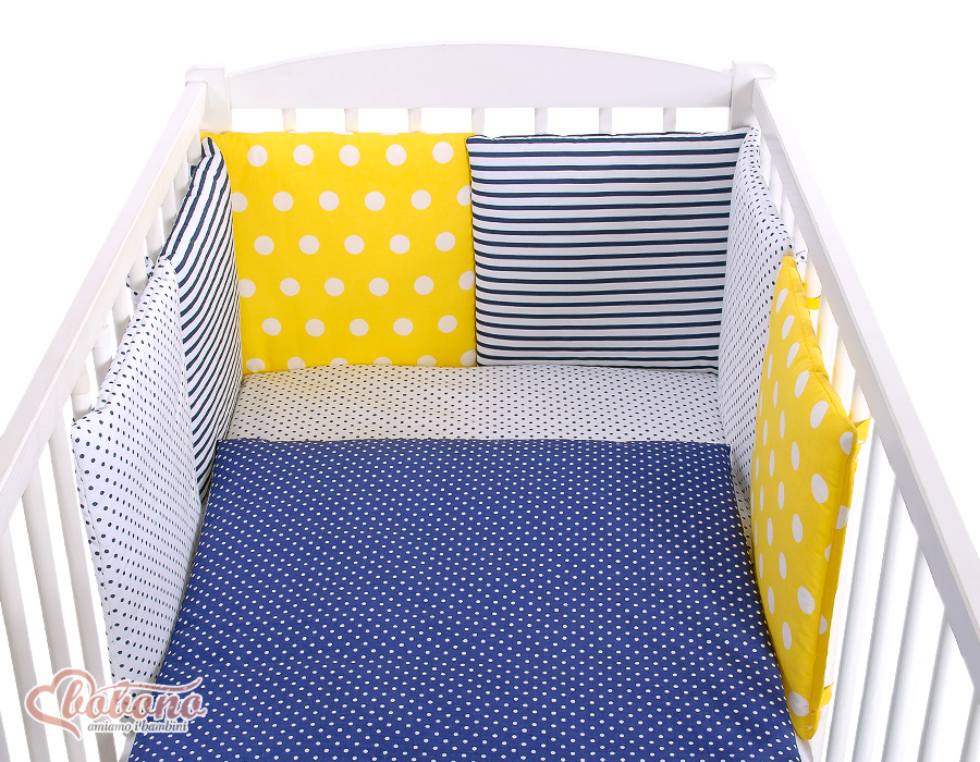3-8. Universal bumper 6pcs- the bumper is made of 6 pillows filled with a special non-allergic and breathable silicone Filling (certified OKOTEX). The size of one pillow is 32cm x 32cm. Cover of the bumper or made of 100% cotton. Pillows have fastening strips to match them each other. You can match the pillows in any order. It is a perfect decoration of baby cot. If we match every pillows together the bumper can be used as a playing mat for baby.