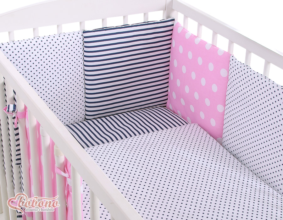 3-8. Universal bumper 6pcs- the bumper is made of 6 pillows filled with a special non-allergic and breathable silicone Filling (certified OKOTEX). The size of one pillow is 32cm x 32cm. Cover of the bumper or made of 100% cotton. Pillows have fastening strips to match them each other. You can match the pillows in any order. It is a perfect decoration of baby cot. If we match every pillows together the bumper can be used as a playing mat for baby.
