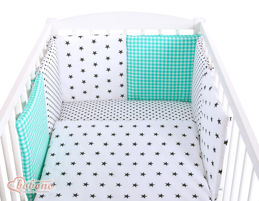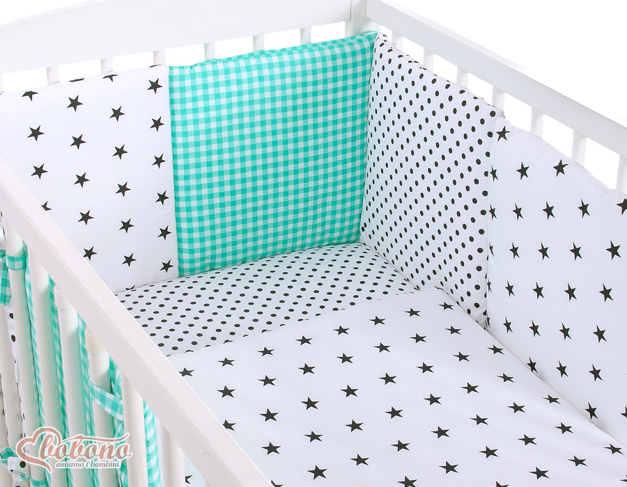 3-8. Universal bumper 6pcs- the bumper is made of 6 pillows filled with a special non-allergic and breathable silicone Filling (certified OKOTEX). The size of one pillow is 32cm x 32cm. Cover of the bumper or made of 100% cotton. Pillows have fastening strips to match them each other. You can match the pillows in any order. It is a perfect decoration of baby cot. If we match every pillows together the bumper can be used as a playing mat for baby.
